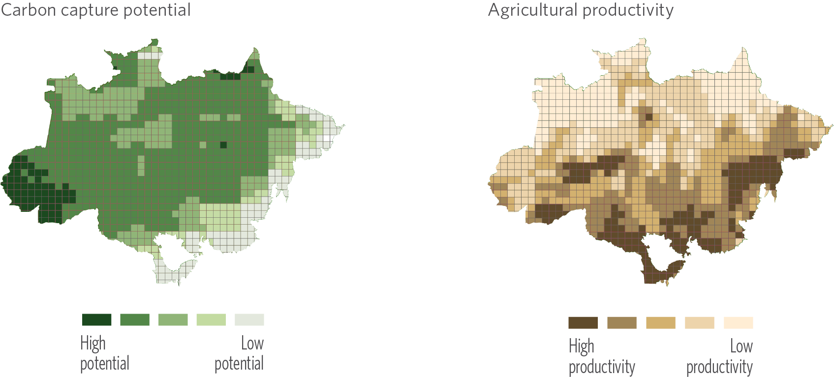 The Brazilian Amazon offers a powerful illustration of how RDM could deliver both climate and economic benefits. In a recent study, Assunção, Hansen, Munson, and Scheinkman (2025) analyze the implications of implementing such a mechanism in the region. Their analysis leverages rich spatial data on carbon sequestration potential and agricultural revenues across more than 1,000 sites, with a particular focus on cattle ranching—the dominant land use in deforested areas. The Amazon exhibits high levels of heterogeneity: some sites have high carbon capture potential and low agricultural productivity, while others show the opposite pattern (Figure 11). This variation is central to understanding where and how forest restoration can be most effective.