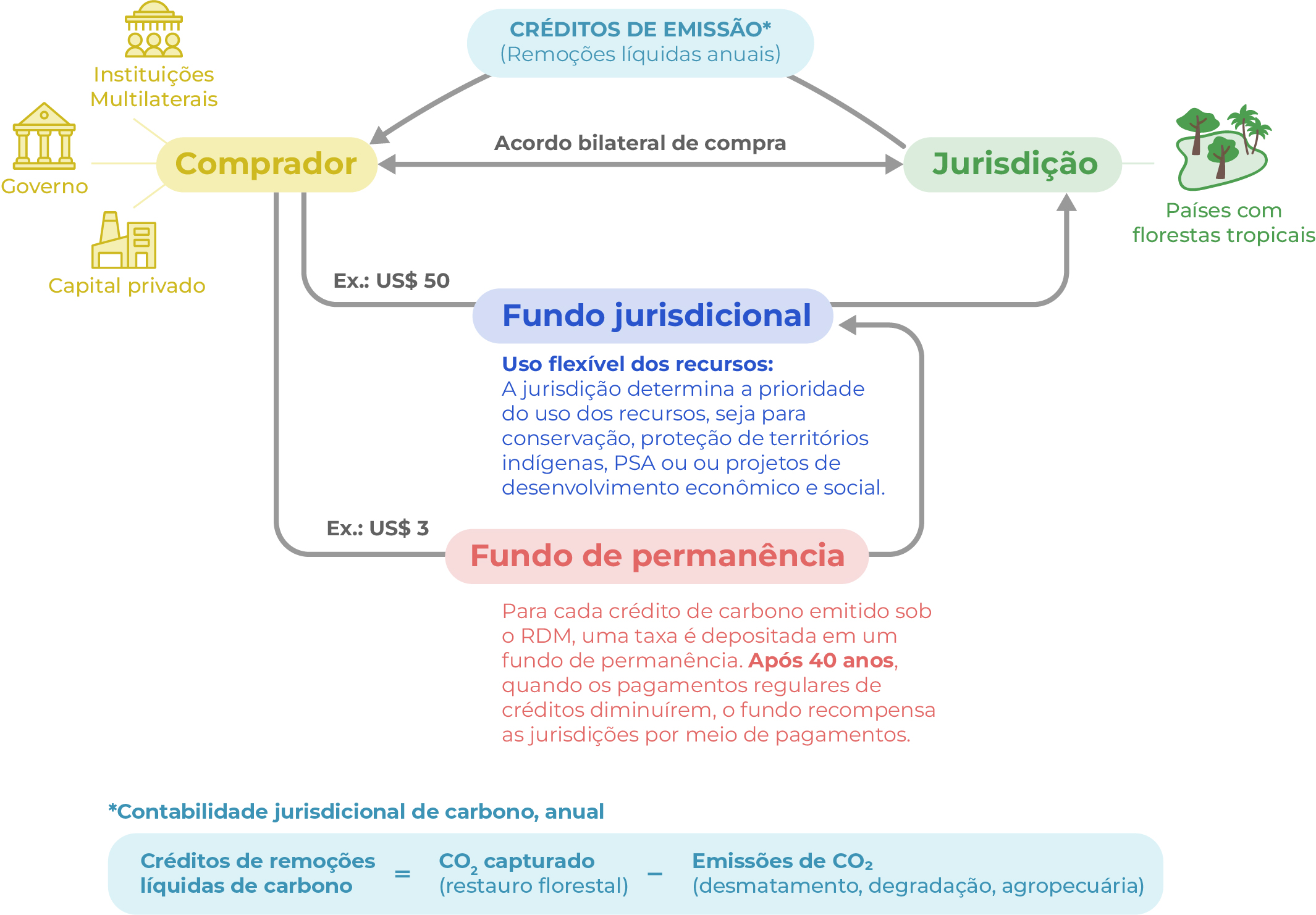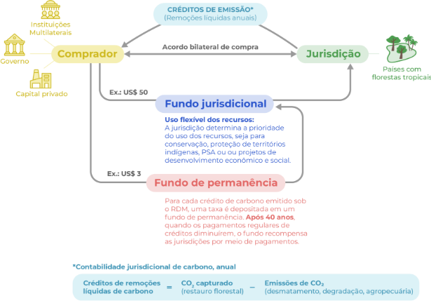 Enquanto os mecanismos já existentes, como o REDD+ jurisdicional (JREDD+) e o Fundo Florestas Tropicais para Sempre (TFFF), focam em conter o desmatamento e preservar as florestas, o RDM cobre a lacuna atual de financiamento para restauração em escala. O mecanismo foi idealizado para compensar as remoções líquidas de carbono, isto é, o CO2 equivalente capturado por meio da restauração florestal, subtraindo as emissões provenientes do desmatamento, da degradação florestal e de atividades agropecuárias.
