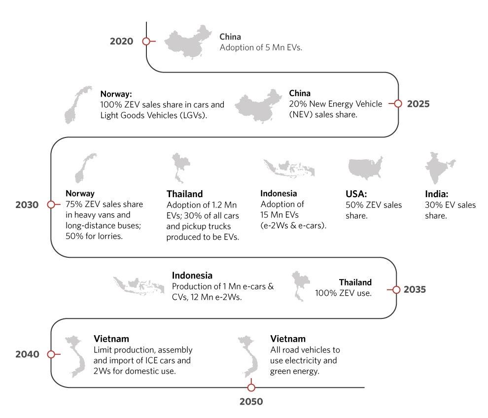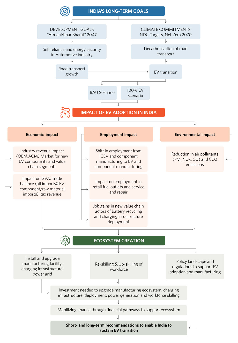 Managing the transition requires evidence-based policy design and focused financial backing, grounded in rigorous impact evaluations and analysis across the automotive value chain. India’s broader energy transition ambitions reinforce this need. The Atmanirbhar Bharat (Self-Reliant India) vision includes a long-term goal of achieving energy independence by 2047. This ambition, alongside India’s commitment to reach net zero emissions by 2070, requires a gradual shift from a fossil fuel–dependent economy toward one powered by renewable energy, green hydrogen, and electric mobility (PIB 2025 Aug). This transition will require accelerated action well before 2070, with 2047 as a critical milestone given the long investment cycle across energy, transport, and industrial systems.