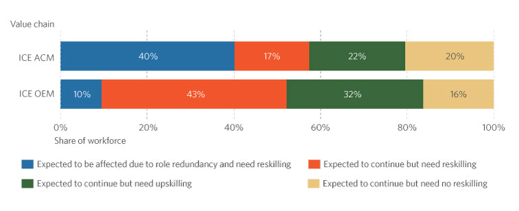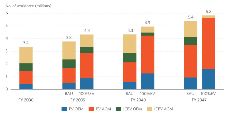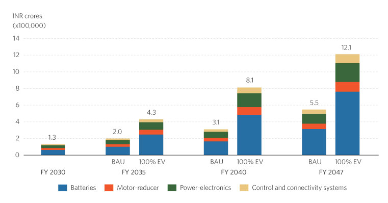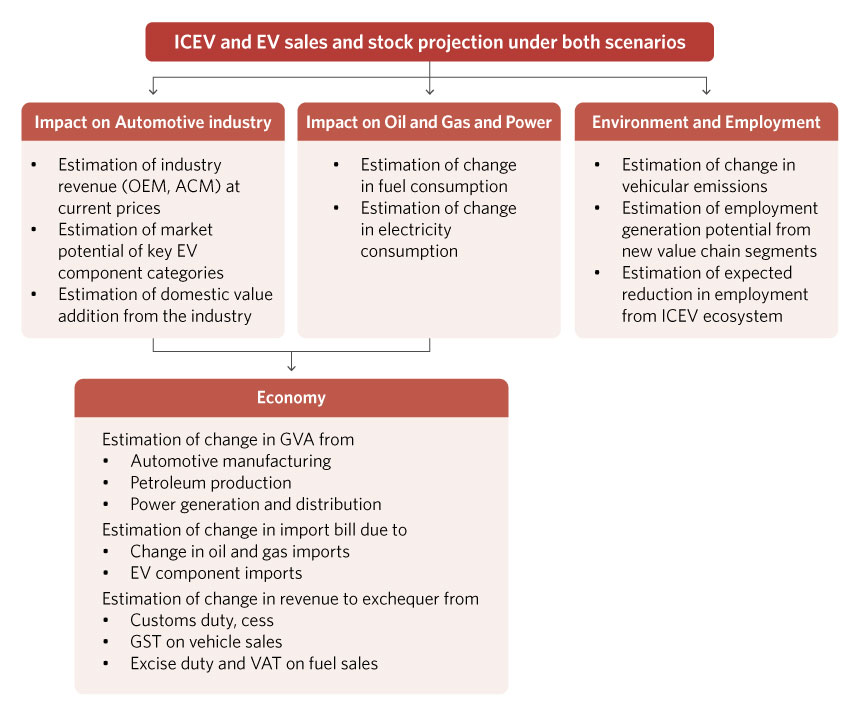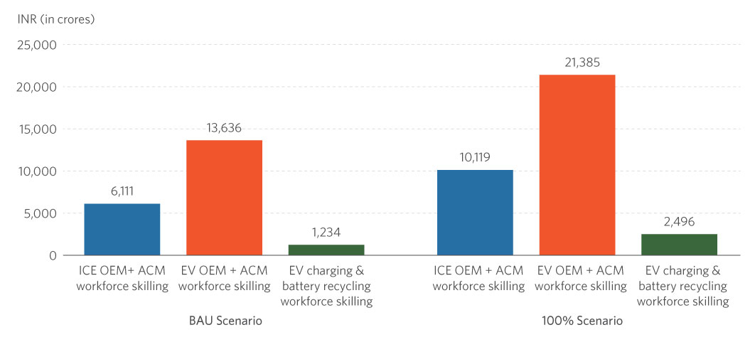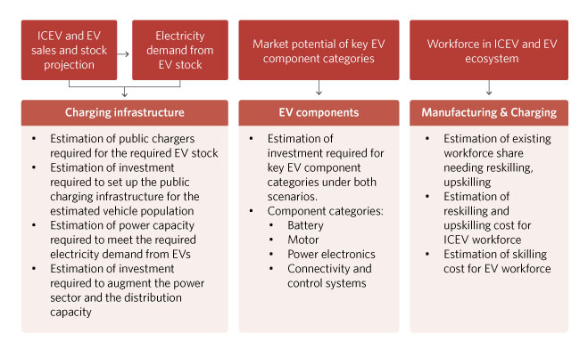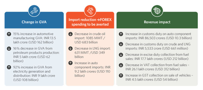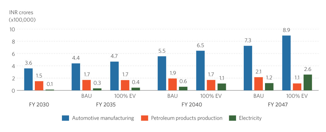 The EV transition will create new employment opportunities in battery manufacturing, charging infrastructure deployment, and battery recycling. These emerging segments present opportunities for domestic value addition, technological upgradation, and new employment generation aligned with high-skill manufacturing and services. However, internal combustion engine-specific manufacturing and traditional supply chain players could face revenue risks as demand for ICEVs declines. The ripple effects of the transition extend further, impacting employment and revenue of adjacent sectors, including fuel retail and aftermarket services, such as repair and maintenance.