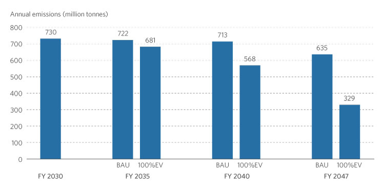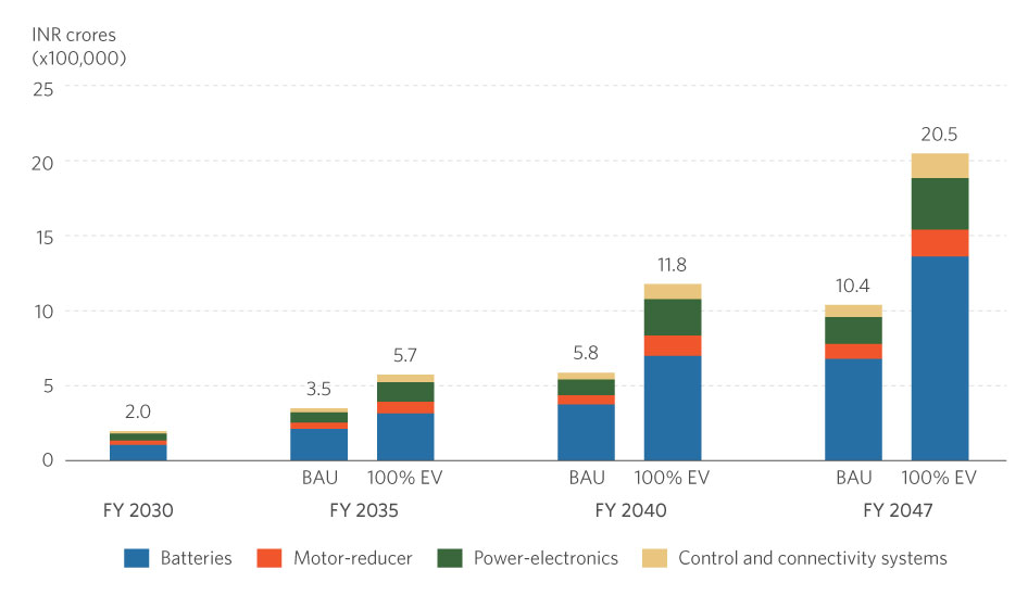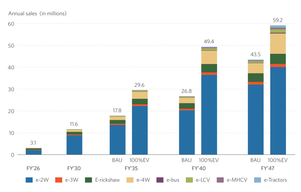 Against this backdrop, a 100% EV scenario assessment is key to understanding the scale of benefits, challenges, and support required across the economy. This study, therefore, conducts a quantitative, scenario-based assessment of India’s automotive value chain with EV adoption under a business-as-usual (BAU) and a full electrification (100% EV) scenario achievable with additional policy support. This report analyzes the impact of a complete transition to EVs on economic growth, jobs, and climate action in India by 2047. It captures impacts across manufacturing, employment, energy demand, and emissions to comprehensively evaluate the opportunities and transition risks associated with large-scale electrification.