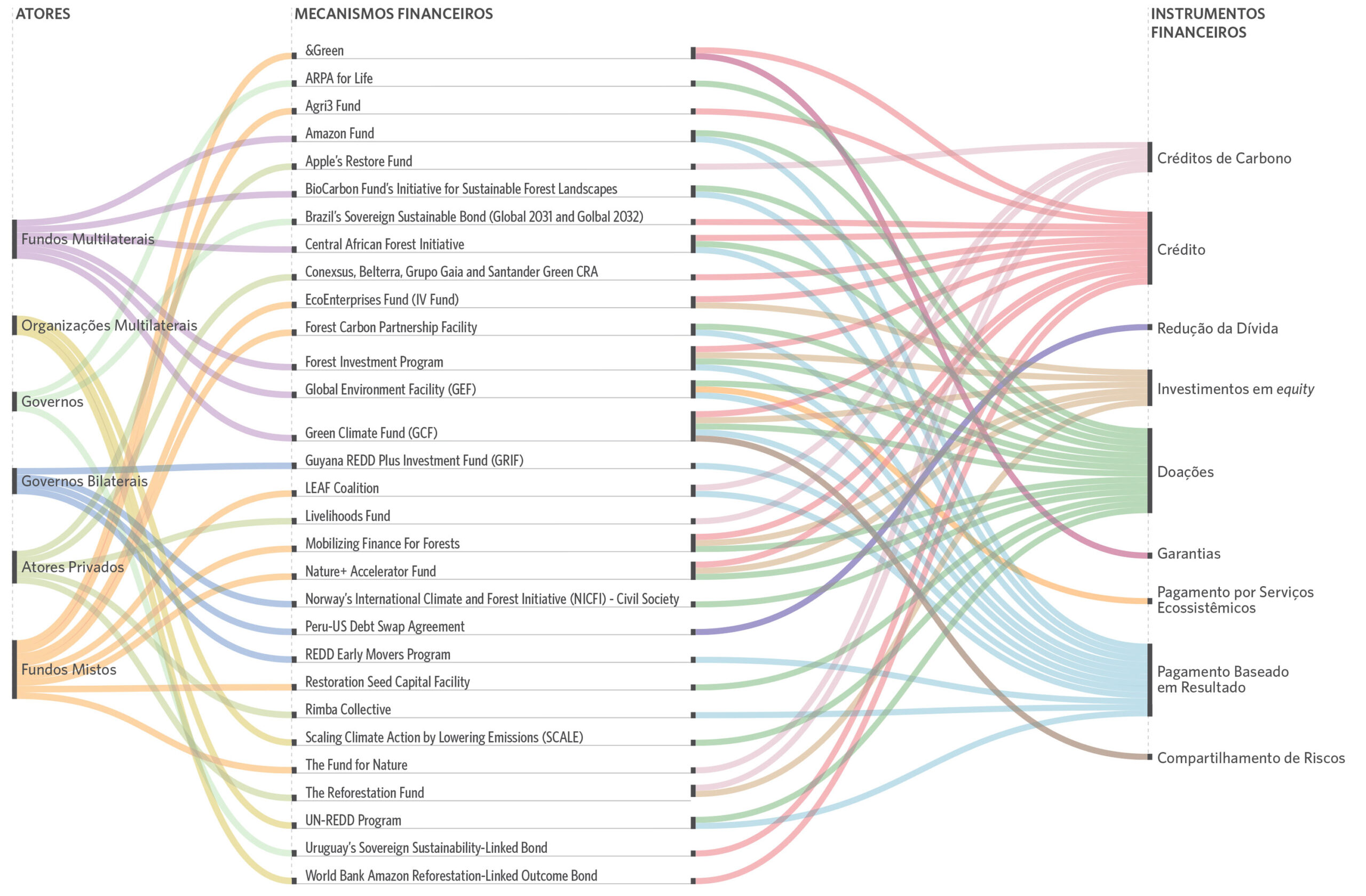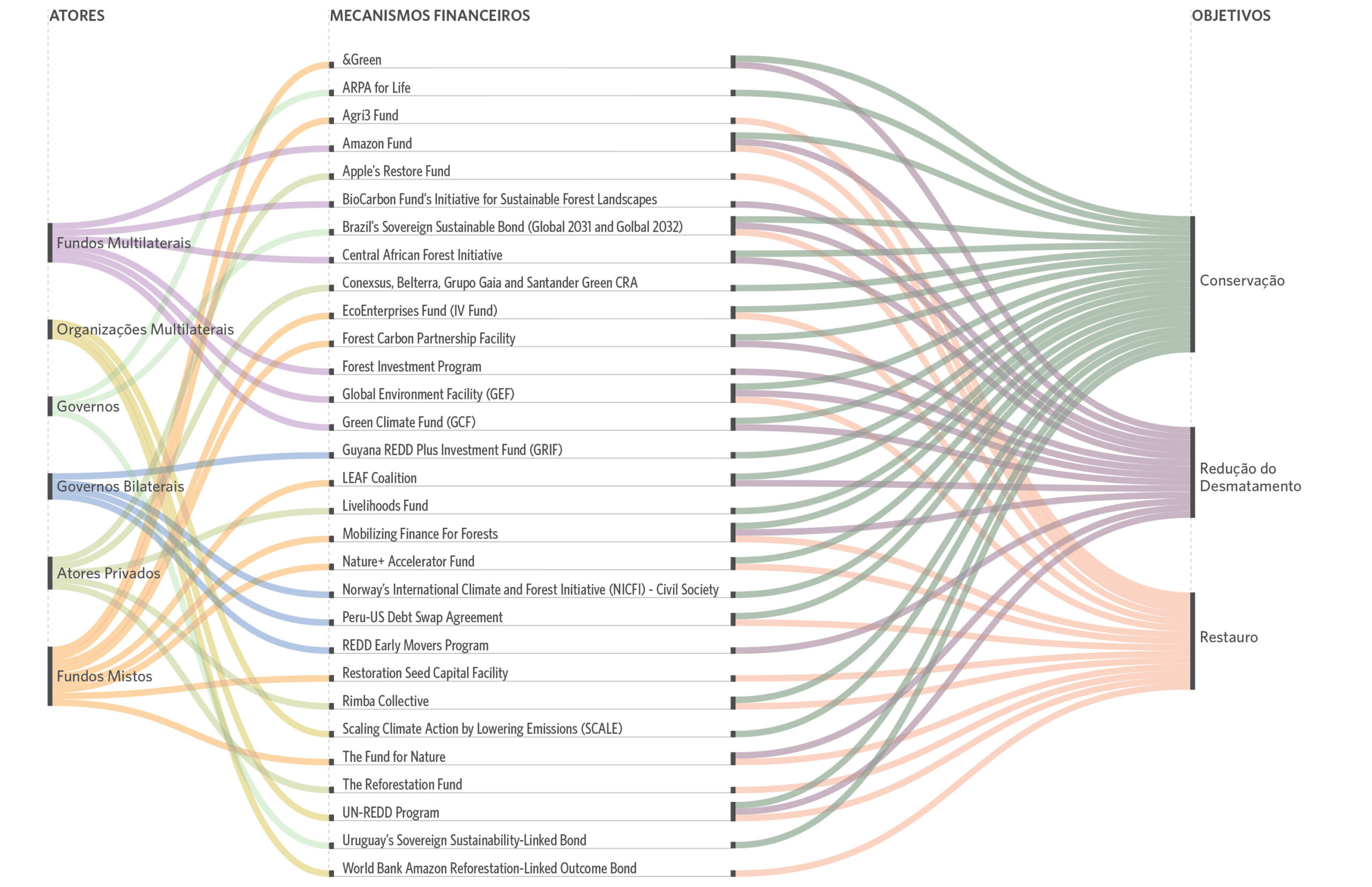 Mapeamento de 30 mecanismos financeiros internacionais por atores, instrumentos financeiros e objetivos florestais.