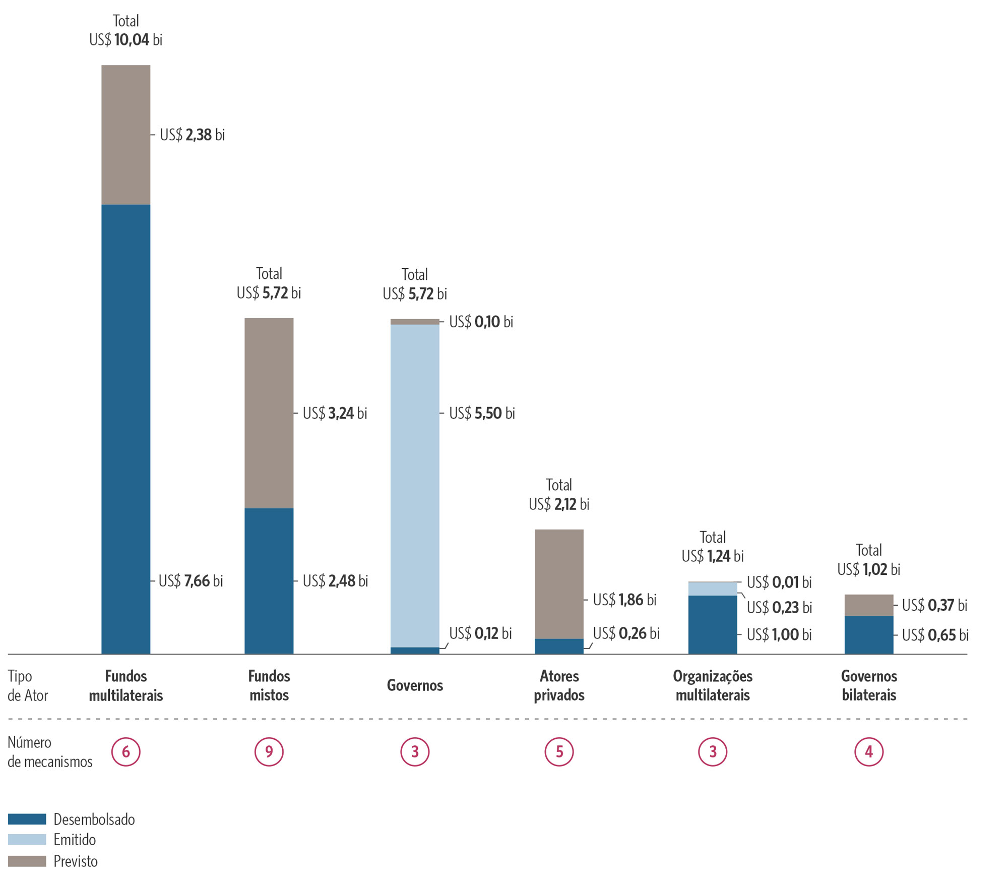 Por fim, este exercício de mapeamento identifica um conjunto diversificado de atores responsáveis pela alocação e gestão de capital, incluindo fundos multilaterais, organizações multilaterais, governos, governos bilaterais, atores privados e fundos mistos. Cada um dos atores direciona investimentos com base em diferentes mandatos, capacidades, incentivos e níveis de tolerância ao risco.[5]