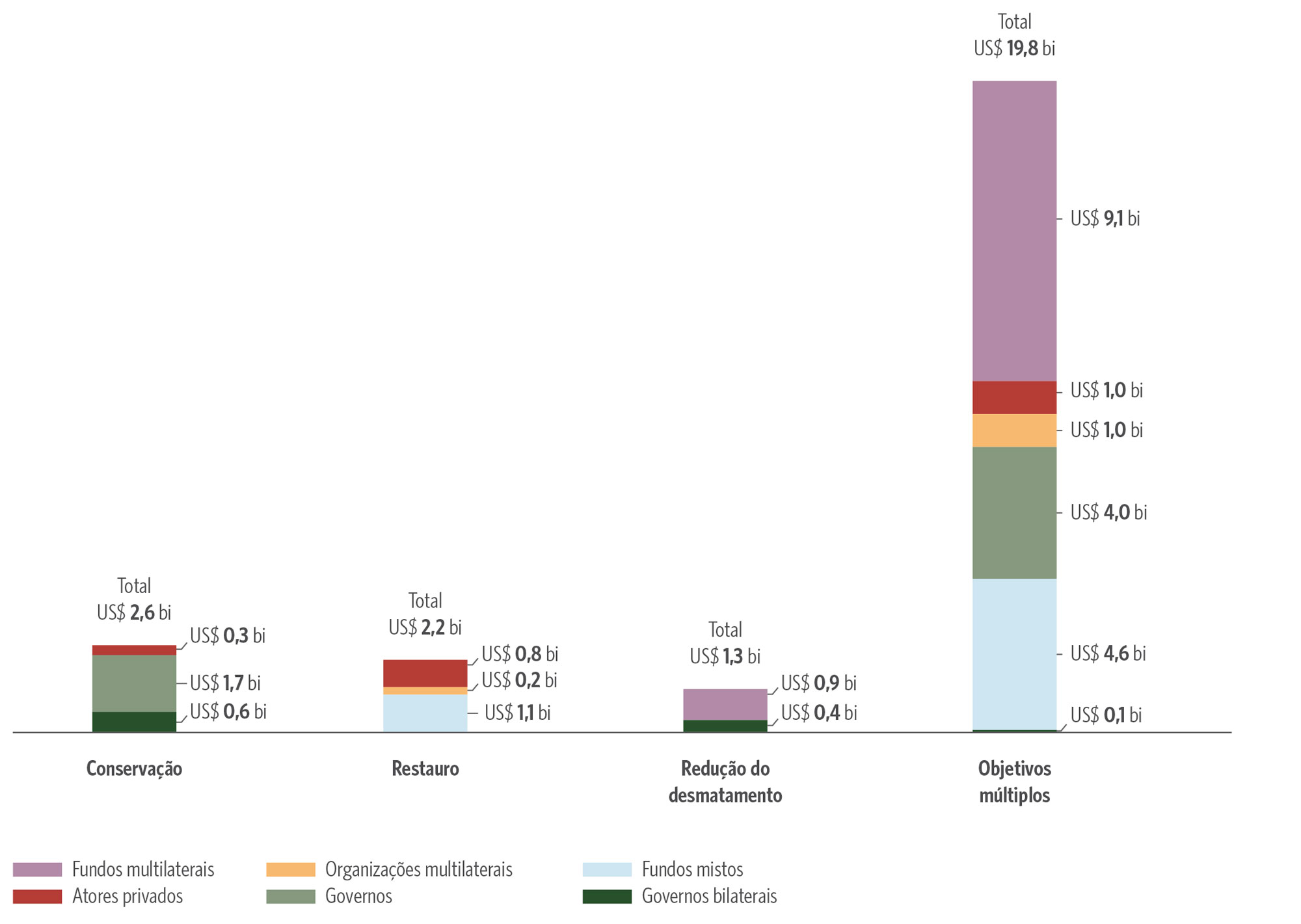 [5] Os atores nesta análise são caracterizados de acordo com a natureza de seu financiamento e governança. Os atores públicos incluem mecanismos liderados pelo governo, implementados por instituições nacionais ou regionais que utilizam recursos públicos domésticos; fundos multilaterais, que recebem contribuições de três ou mais países e operam com gestão autônoma; organizações multilaterais, compostas por vários países que elaboram e executam programas e projetos transfronteiriços; e mecanismos governamentais bilaterais, que canalizam fundos públicos diretamente de um país para outro. Os atores privados referem-se a mecanismos financiados exclusivamente pelo setor privado que investem ou fornecem financiamento para projetos relacionados com as florestas. Os fundos mistos combinam diferentes tipos de capital — público, filantrópico e/ou privado — sob estruturas de gestão autônomas ou dedicadas.