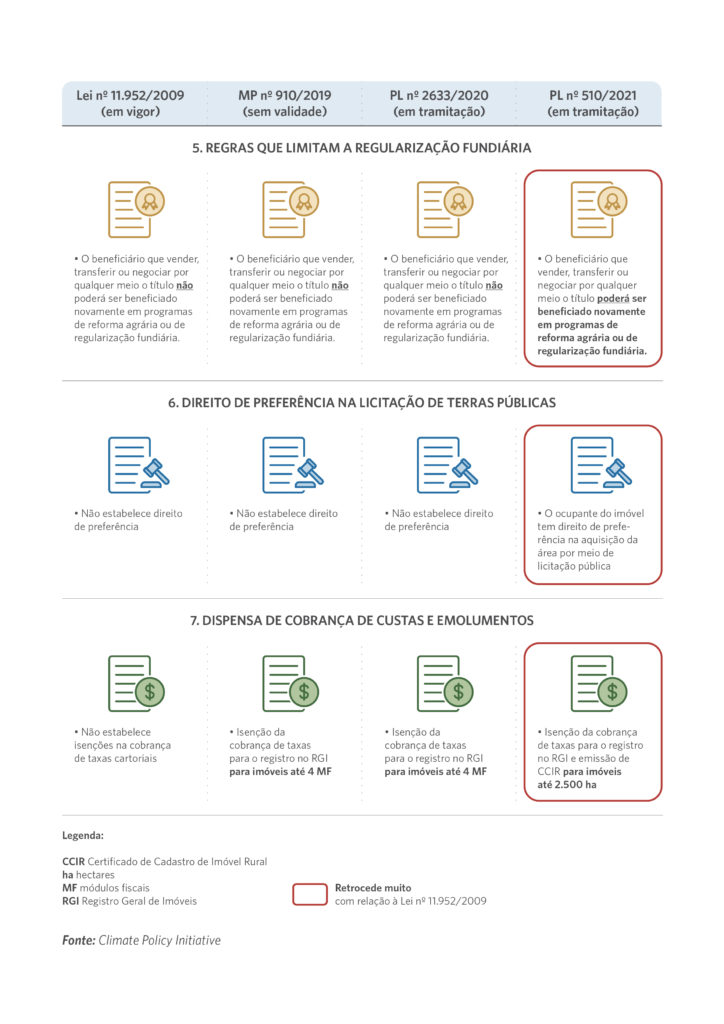 Para entender o que está em discussão e avaliar as implicações do PL nº 510/2021 nas políticas fundiária e ambiental, pesquisadoras do Climate Policy Initiative/Pontifícia Universidade Católica do Rio de Janeiro (CPI/PUC-Rio) selecionaram os principais parâmetros da Lei nº 11.952/2009 alterados pelo PL nº 510/2021 (Tabela 1) e compararam a lei em vigor com os dois principais projetos de lei em discussão, o PL nº 2633/2020 e o PL nº 510/2021. Como ambos os projetos de lei são originários da MP nº 910/2019, esta norma também faz parte do quadro comparativo (Figura 1).