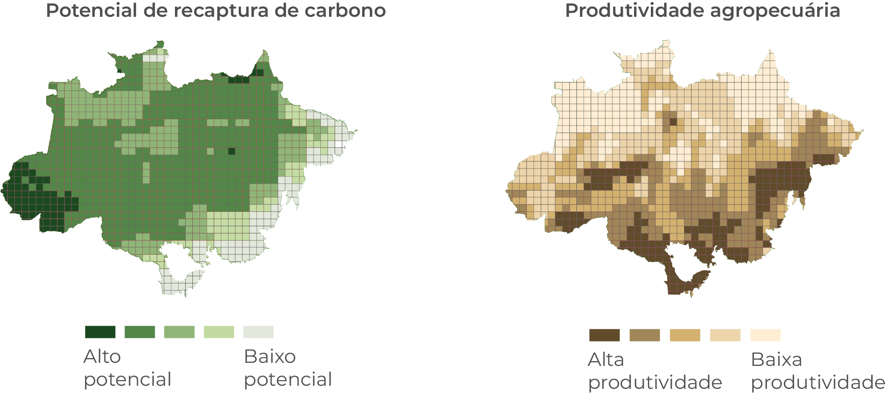 Como mostra a Figura 1, essas duas vocações frequentemente não coincidem: regiões com alto potencial de captura de carbono muitas vezes não são as mais produtivas para a pecuária, e áreas mais adequadas à atividade agropecuária tendem a apresentar menor capacidade de sequestro de carbono. Essa heterogeneidade cria uma oportunidade estratégica: o uso eficiente da terra na Amazônia permite conciliar o aumento da produção agropecuária em áreas já desmatadas com a conservação e a restauração florestal, maximizando, com isso, tanto os ganhos econômicos quanto os benefícios climáticos.