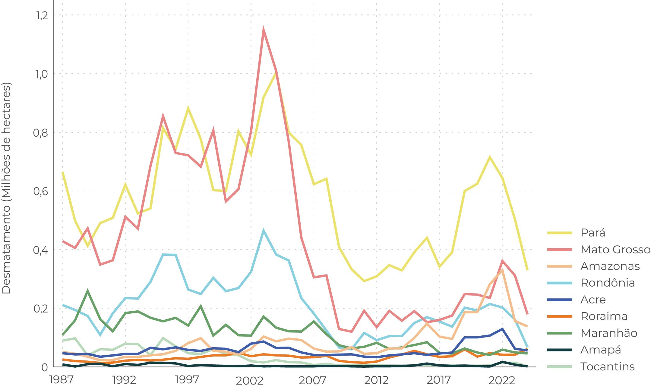Figura 3. Trajetória do Desmatamento (1985-2024) por Estado Brasileiro no Bioma Amazônico