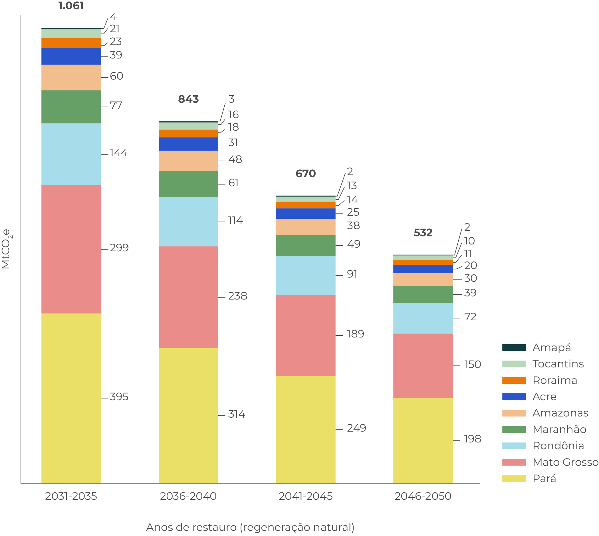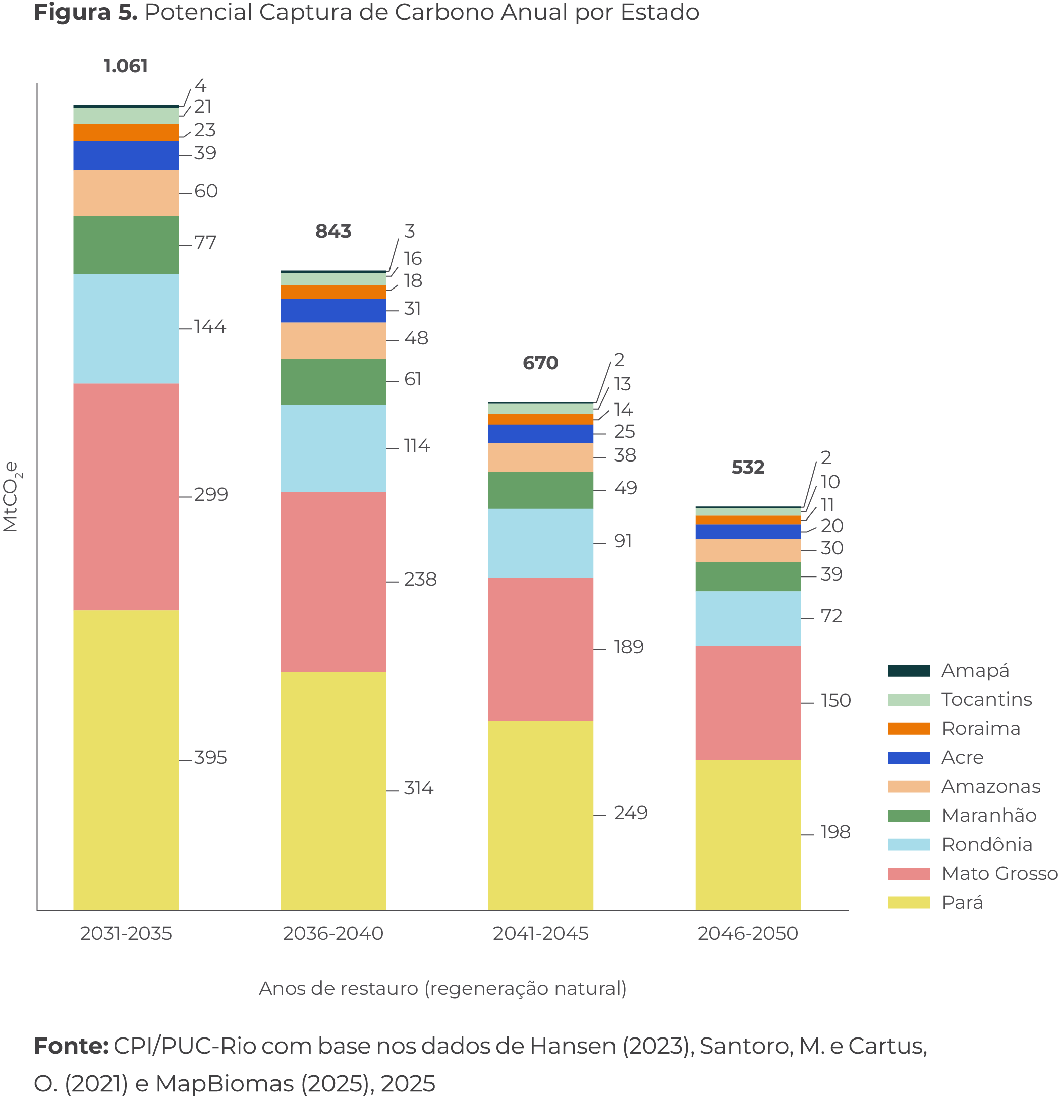 A análise realizada neste estudo indica que, por meio de regeneração natural nas áreas já desmatadas, seria possível capturar até 26 GtCO2 em toda a região Amazônica. A Figura 5 detalha esse potencial de captura por estado, mostrando como as oportunidades de restauração se distribuem no tempo e no espaço e permitindo avaliar o momento e a relevância climática dessas capturas, que tendem a diminuir ao longo dos anos à medida que o crescimento das florestas se estabiliza e a absorção de carbono se reduz com a maturação do ecossistema. A projeção considera o início da restauração em 2031, em alinhamento com o cronograma do Balanço Global da COP28, e apresenta os resultados em intervalos de cinco anos, acompanhando os ciclos de revisão e aumento de ambição climática previstos no Acordo de Paris.