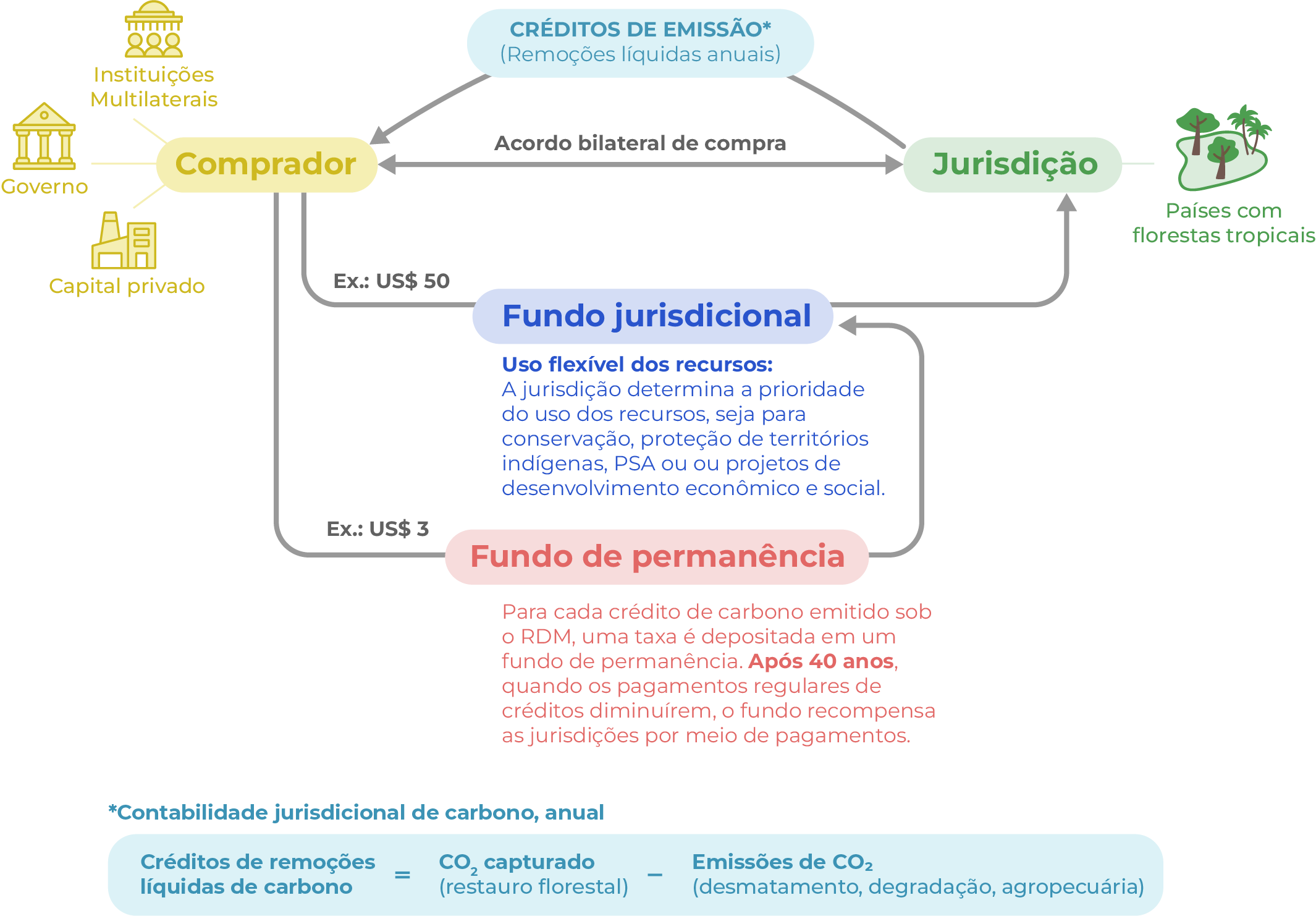 Os recursos gerados por esses créditos alimentam um fundo jurisdicional, cujos recursos são destinados segundo regras definidas localmente. Há incentivos para que a jurisdição aloque parte dos recursos para atividades diretamente ligadas à captura líquida de carbono, como designação de terras, consolidação de áreas protegidas e terras indígenas, e pagamentos por serviços ambientais em propriedades privadas. Outra parte dos recursos pode ser usada de forma flexível, apoiando ações que previnam novos desmatamentos, ampliem a restauração florestal com modelos de restauro ativo ou atendam a necessidades sociais típicas de países em desenvolvimento, como combate à pobreza, saúde, educação, segurança e infraestrutura.