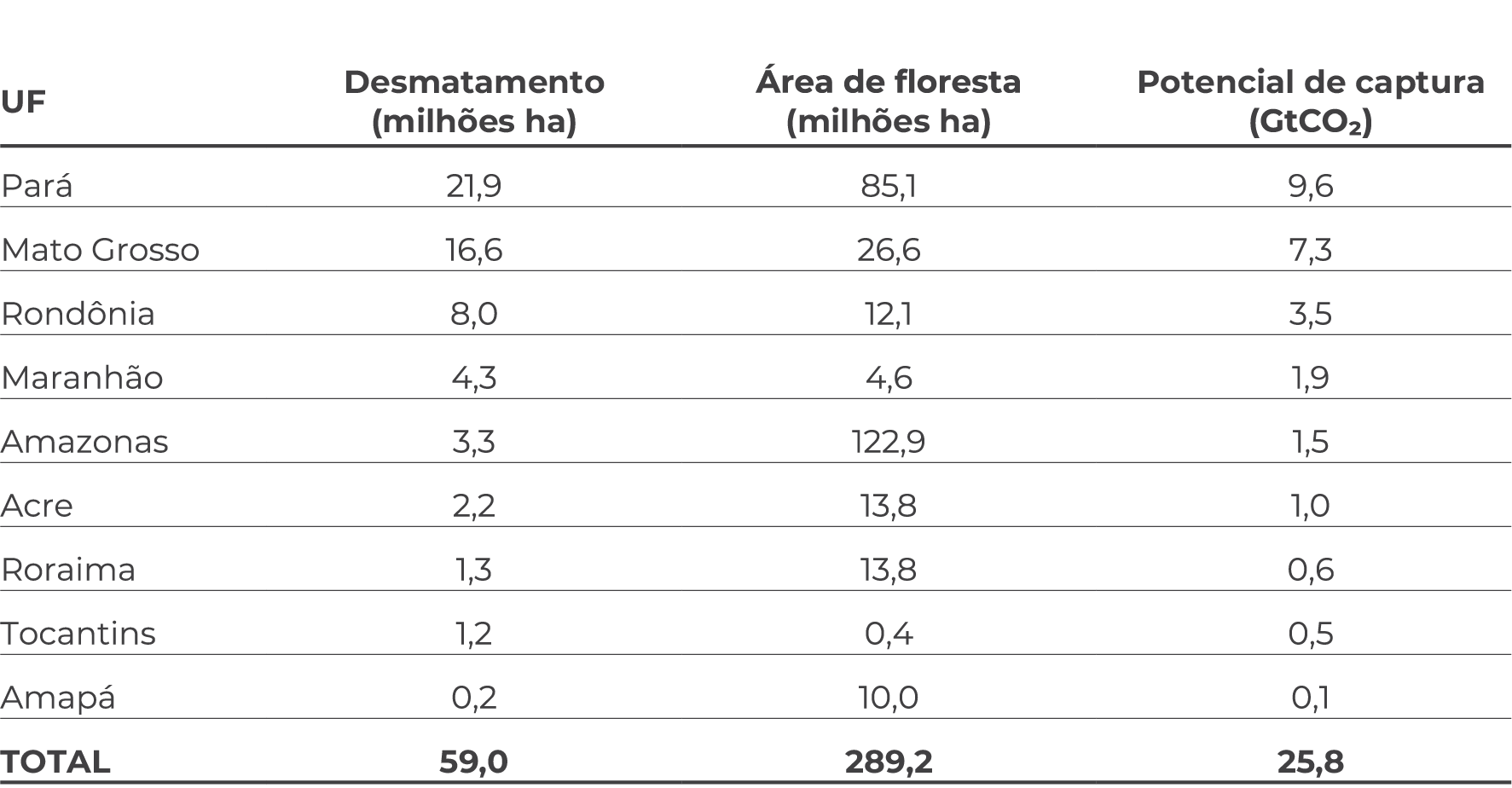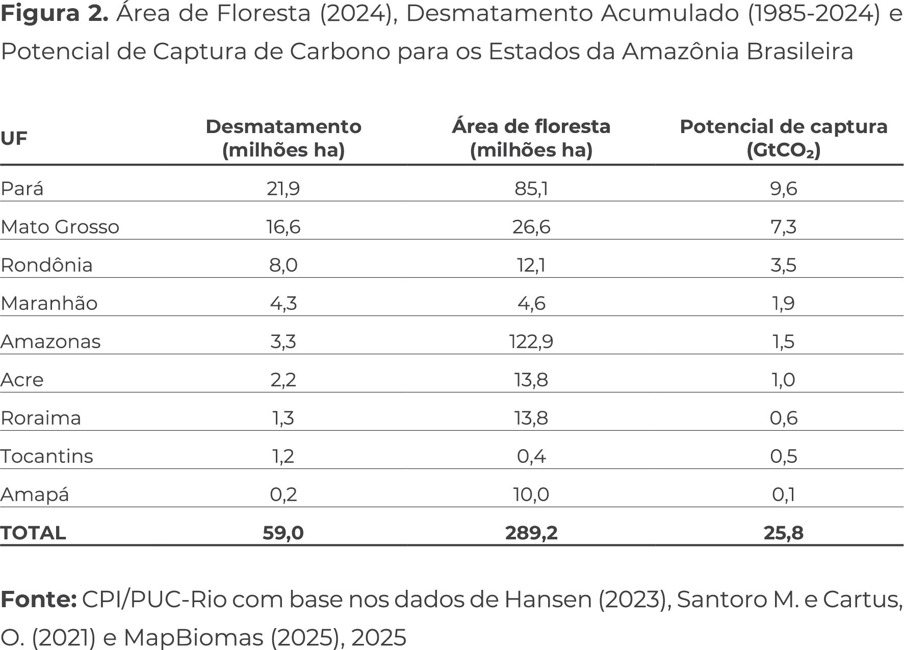 Figura 2. Área de Floresta (2024), Desmatamento Acumulado (1985-2024) e Potencial de Captura de Carbono para os Estados da Amazônia Brasileira