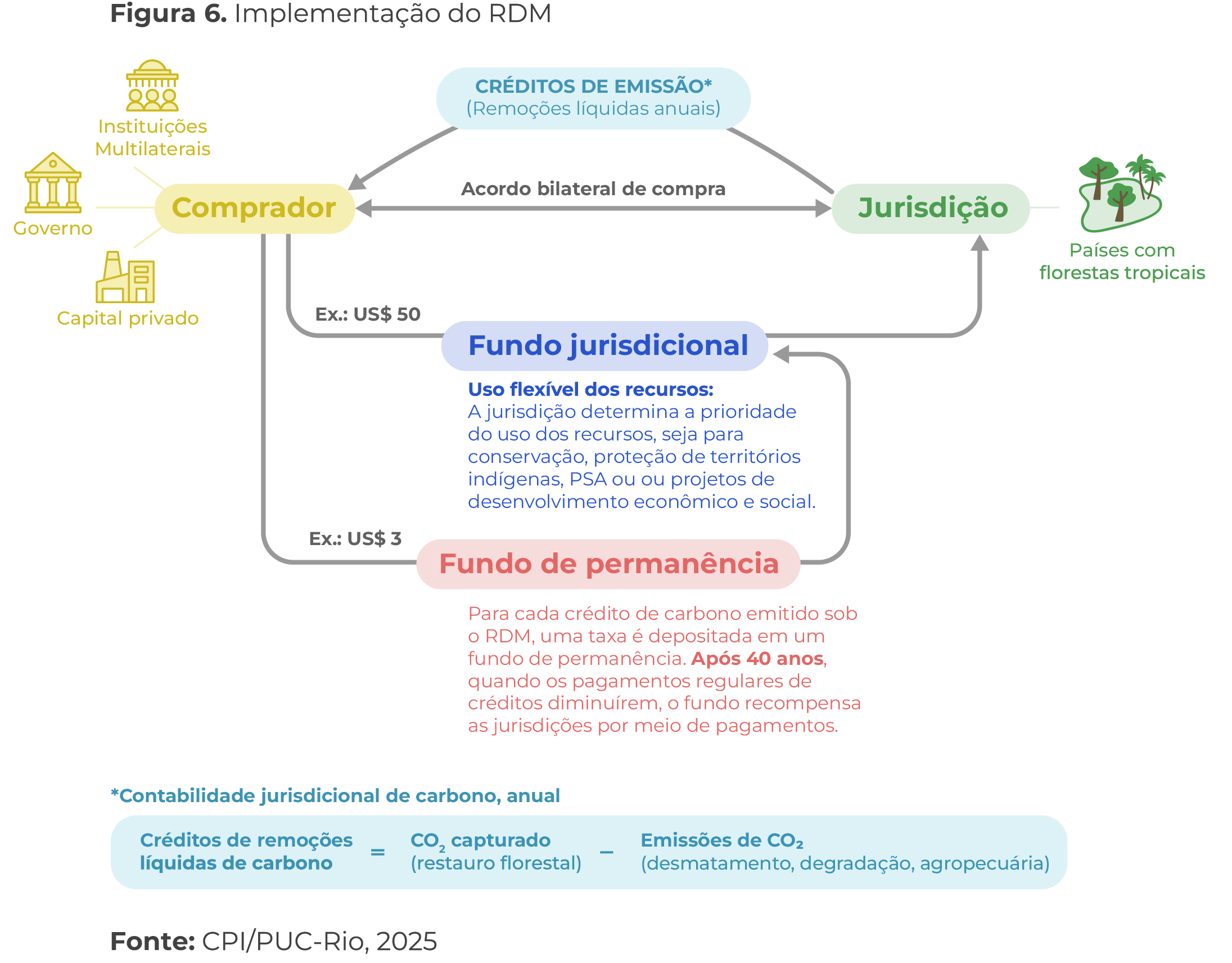 Para a efetiva implementação do RDM, é necessário adotar uma abordagem jurisdicional, evitando vazamentos (leakage) de desmatamento e aproveitando economias de escala na fiscalização. É preciso também garantir a escala da operação, a viabilidade financeira e a permanência dos créditos de longo prazo, já que a captura de carbono por restauração florestal diminui à medida que as florestas amadurecem. O engajamento do setor privado é essencial, impulsionando a restauração ativa e investindo em produtos compatíveis com a floresta. A Figura 6 apresenta a implementação do RDM.