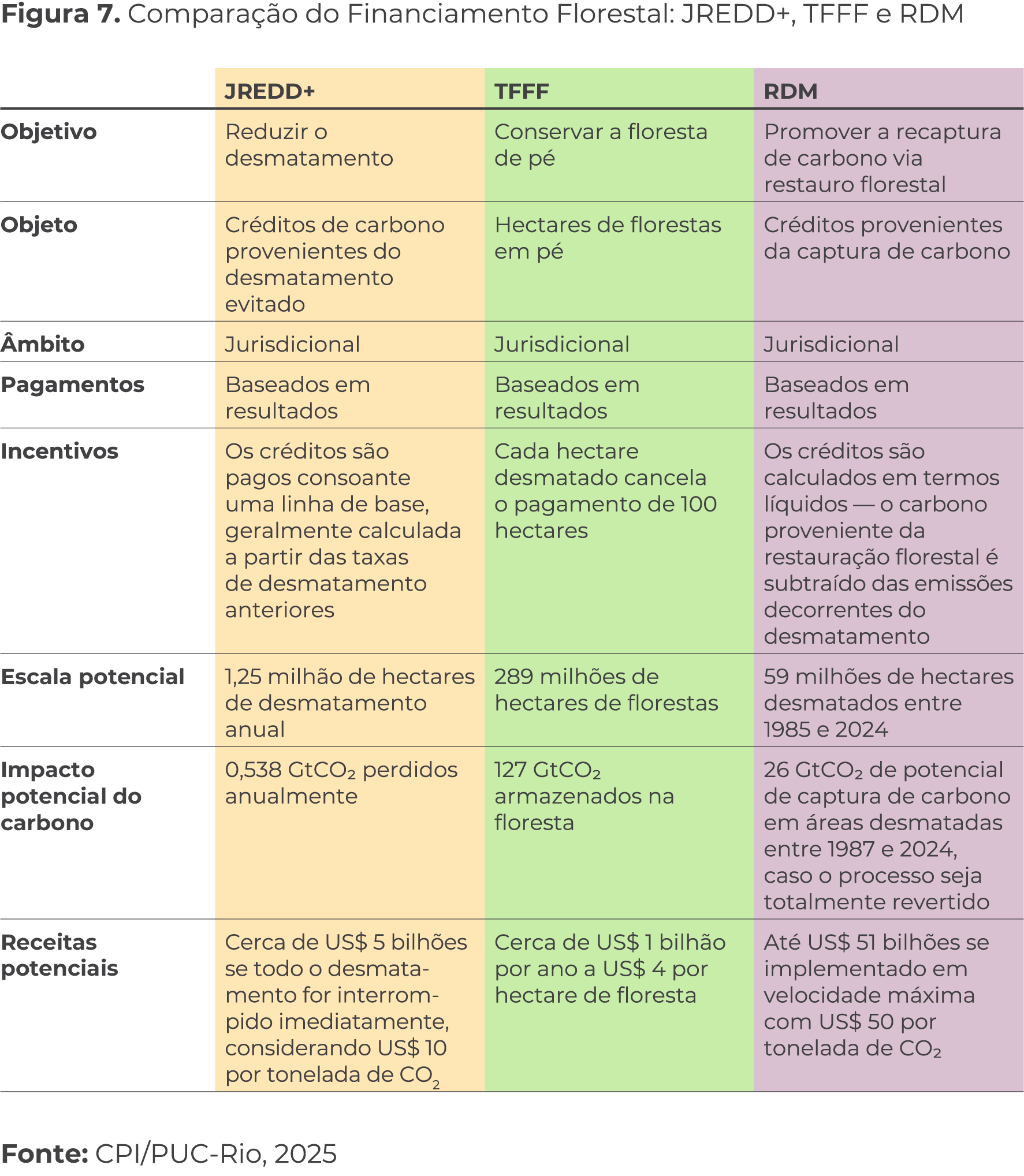 Esses três mecanismos são complementares: enquanto o JREDD+ valoriza a redução do desmatamento, o TFFF remunera o estoque de floresta em pé, e o RDM foca na captura de carbono em larga escala por meio da restauração. Juntos, criam uma arquitetura financeira capaz de endereçar as diferentes dimensões da transição para uma economia de baixo carbono na Amazônia. A Figura 7 compara o potencial e a atuação dos três mecanismos.