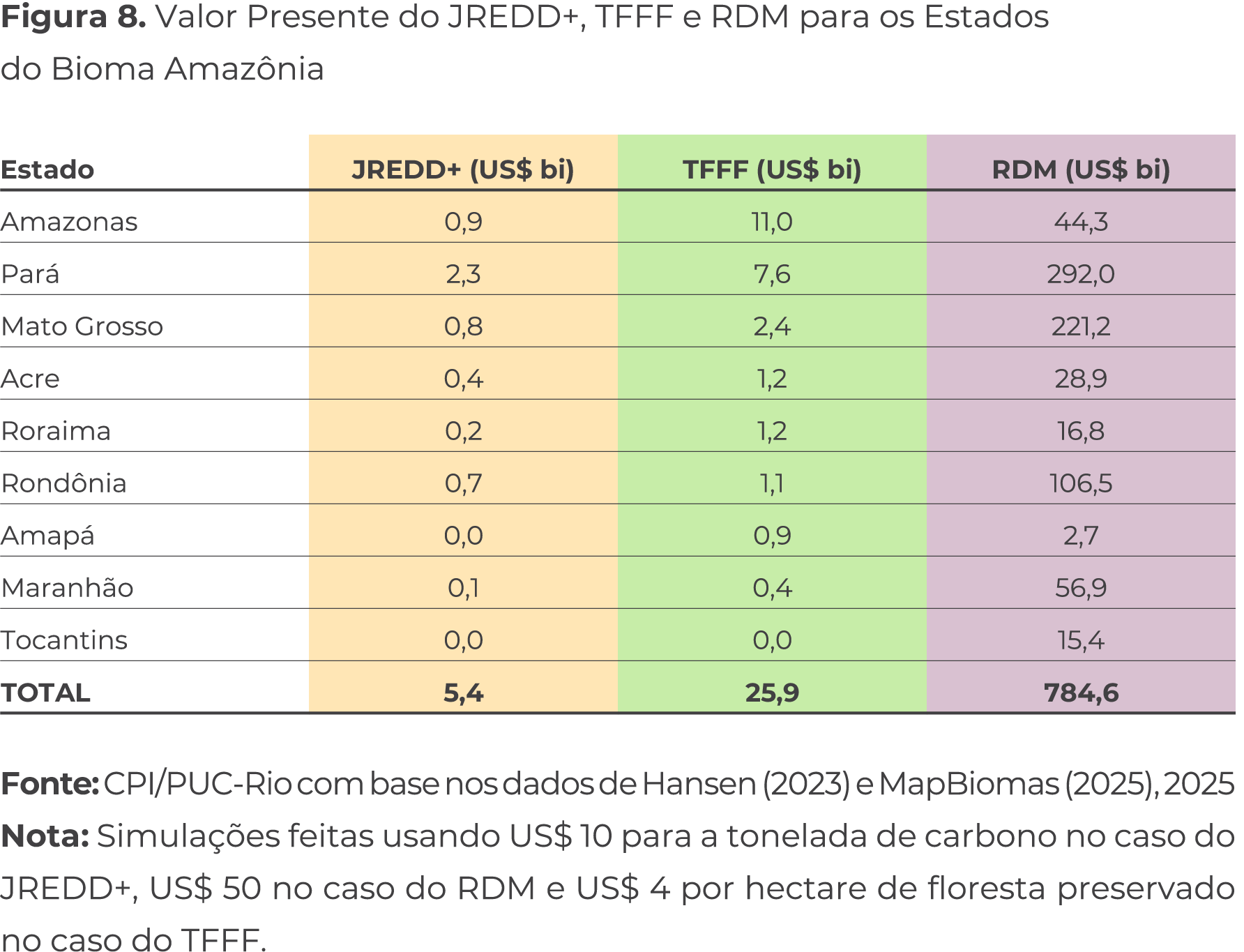 O impacto econômico potencial é expressivo. Para a Amazônia, o TFFF pode gerar uma receita de aproximadamente US$ 26 bilhões, enquanto o RDM alcança aproximadamente US$ 784 bilhões ao longo dos próximos 30 anos, mesmo com a tonelada de carbono sendo precificada a US$ 50. De fato, de acordo com Assunção, Hansen, Munson e Scheinkman (2025), esse valor já é o suficiente para alcançar uma realocação da terra compatível com o cumprimento da Contribuição Nacionalmente Determinada (Nationally Determined Contributions – NDC) brasileira. Além disso, já nos primeiros cinco anos, estima-se que o RDM tenha o potencial de capturar 5,3 GtCO2. Em contrapartida, o JREDD+, se operado isoladamente, poderia gerar pouco mais de US$ 5 bilhões para a Amazônia ao zerar o desmatamento.
