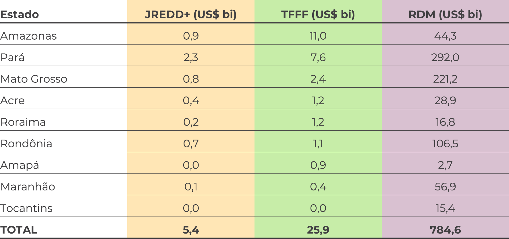 Além disso, o país já dispõe de infraestrutura técnica e institucional robusta, que facilita a implementação do RDM e de mecanismos similares, incluindo monitoramento por satélite, sistemas de alerta de desmatamento, o CAR, experiências jurisdicionais locais e fundos flexíveis, como o Fundo Amazônia. Esses elementos reduzem riscos, fortalecem a governança territorial e criam incentivos claros para que os recursos financeiros sejam alocados de forma estratégica, promovendo a conservação, a restauração e o desenvolvimento sustentável em cada estado da Amazônia.