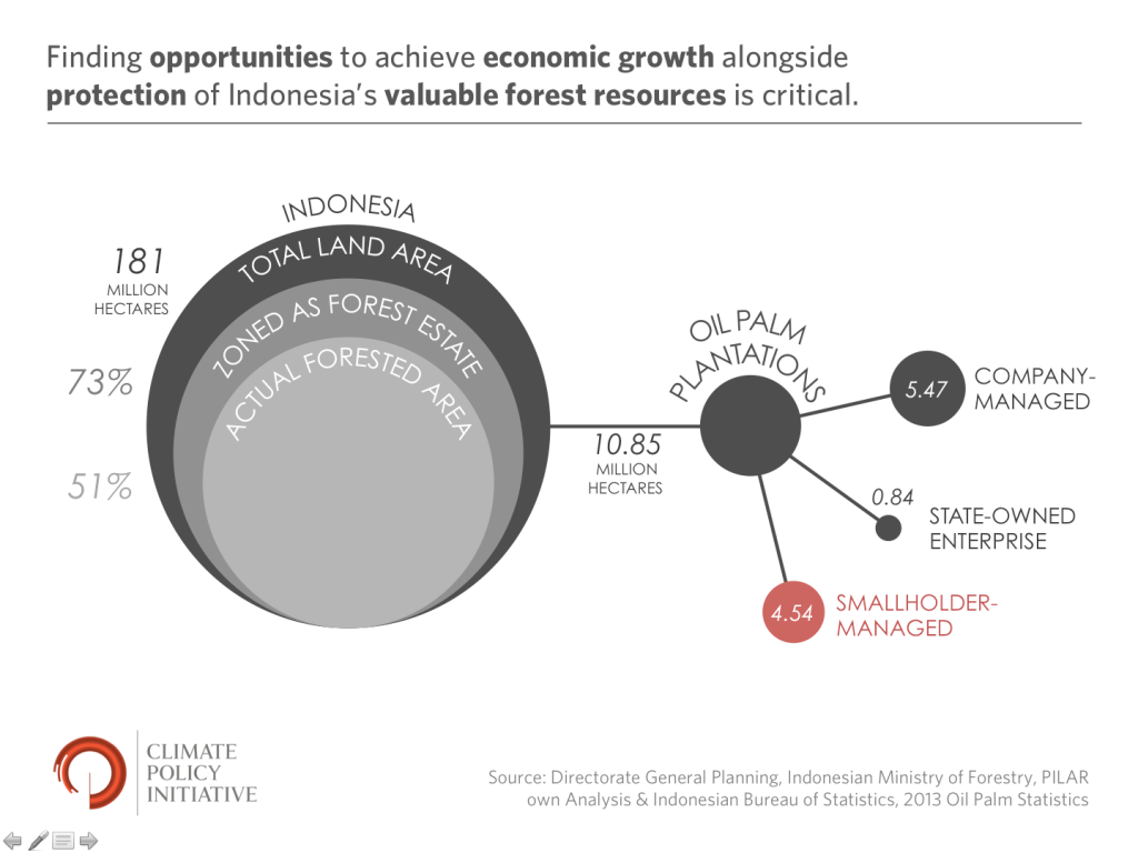 Through the Central Kalimantan Production – Protection Initiative, PILAR and CPI are partnering with government and businesses in Central Kalimantan to develop a plan and model for sustainable oil palm production that can help to increase agricultural productivity throughout the oil palm value chain, while protecting natural resources and delivering benefits to local communities. Under this initiative, CPI is supporting PILAR to conduct research and analysis on production and protection issues for a multi-stakeholder working group that was established by the Governor to help deliver the Government of Central Kalimantan’s vision to optimize land use and build a sustainable palm oil sector. Initial research is identifying the most relevant sectors, actors, and opportunities that could become agents of change. We have identified preliminary opportunities to adjust how land resources are allocated and how fiscal policies can incentivize more sustainable behaviour, as well as to adapt business models to increase local agriculture productivity and mechanisms for sharing benefits more equitably among government, business and community actors.