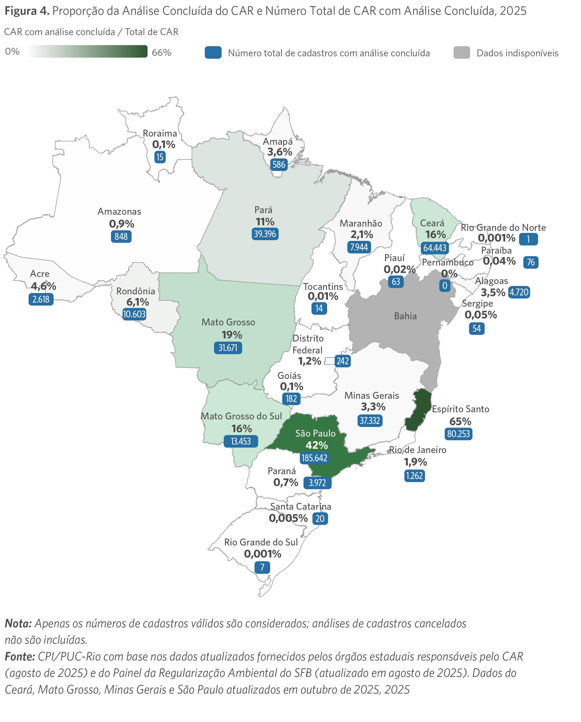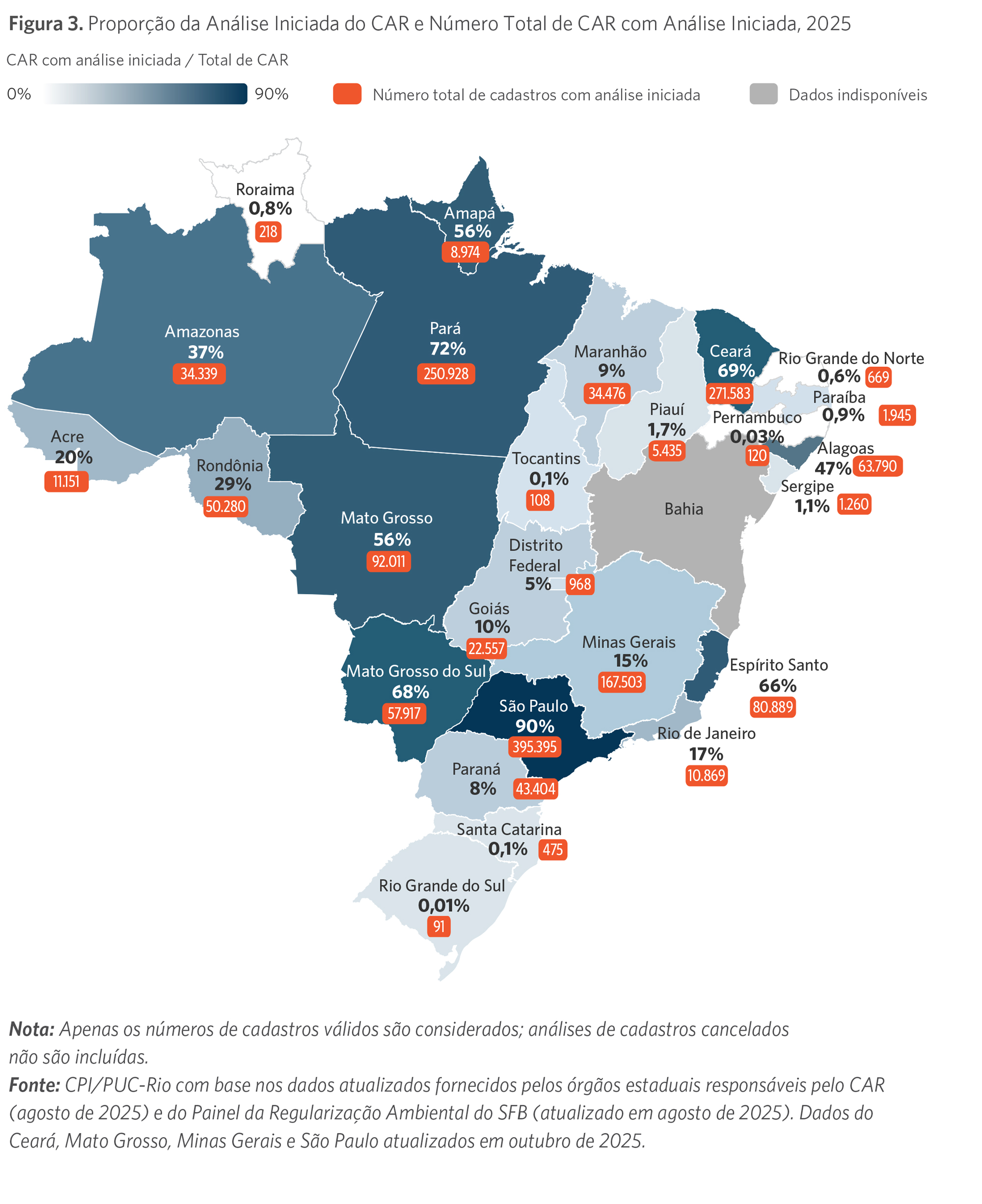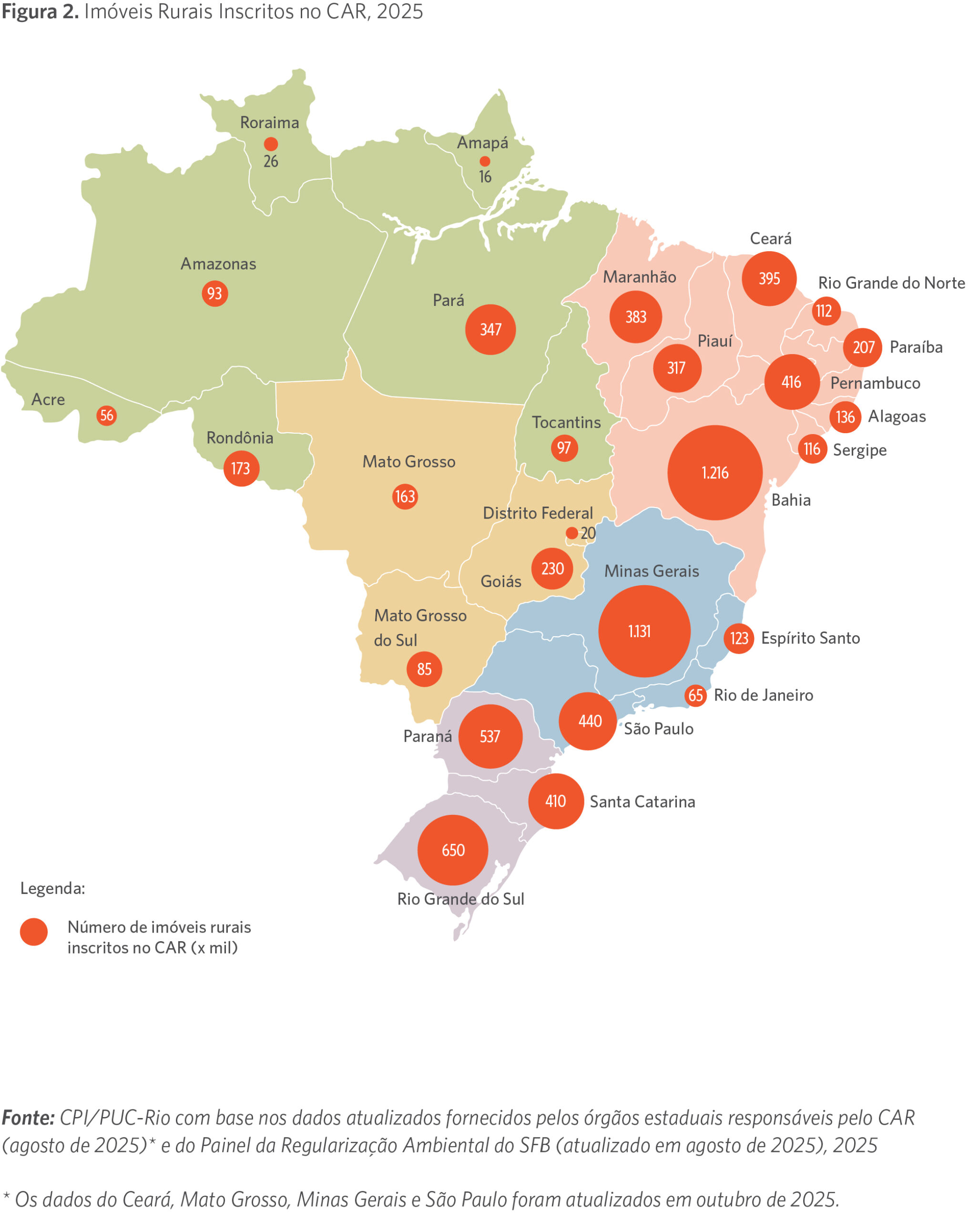 Fonte: CPI/PUC-Rio com base nos dados atualizados fornecidos pelos órgãos estaduais responsáveis pelo CAR (agosto de 2025) e do Painel da Regularização Ambiental do SFB (atualizado em agosto de 2025). Dados do Ceará, Mato Grosso, Minas Gerais e São Paulo atualizados em outubro de 2025, 2025