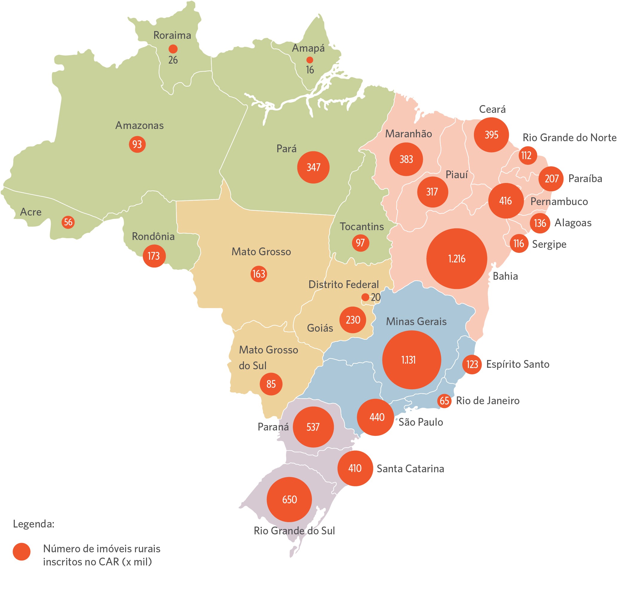 Bahia e Minas Gerais permanecem como os estados com maior número de cadastros, ambos com mais de um milhão de registros (Figura 2). No caso da Bahia, esse número elevado está diretamente relacionado ao modelo de inscrição adotado pelo estado: no Cadastro Estadual Florestal de Imóveis Rurais (Cefir), nome dado ao CAR na Bahia, a inscrição é realizada por matrícula e não por imóvel rural. Como um único imóvel pode conter dezenas de matrículas, isso contribui significativamente para inflar o número total de registros na base estadual.