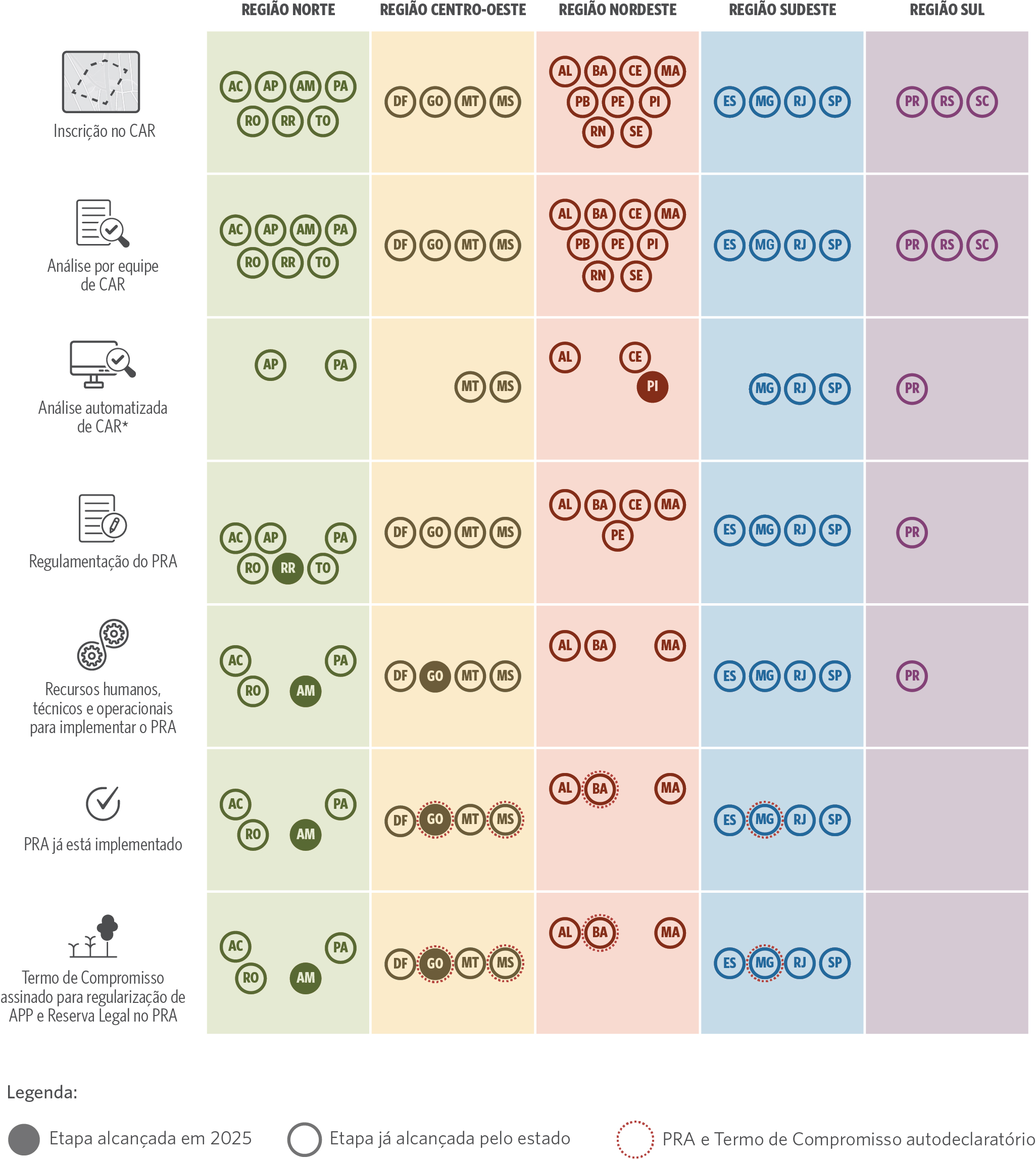 No último ano, Roraima regulamentou o PRA, dando o primeiro passo para a implementação do programa. Ao todo, 20 estados e o Distrito Federal já regulamentaram o PRA e adotaram métricas para a recuperação dos passivos em APP e Reserva Legal. Porém, seis estados — Paraíba, Piauí, Rio Grande do Norte, Rio Grande do Sul, Santa Catarina e Sergipe — seguem atrasados na construção de um conjunto normativo mínimo para a regularização ambiental dos imóveis rurais.