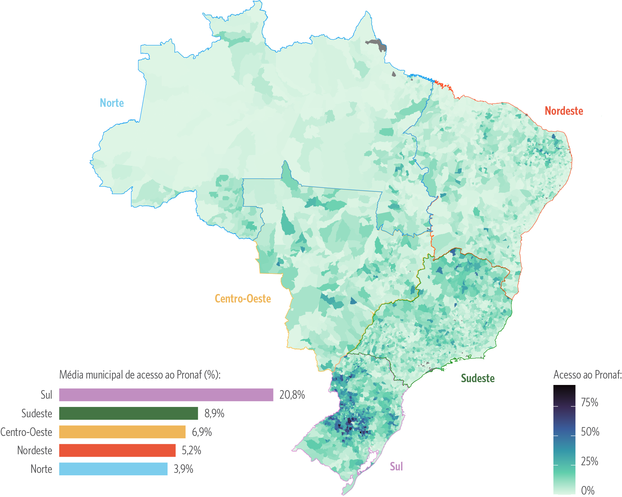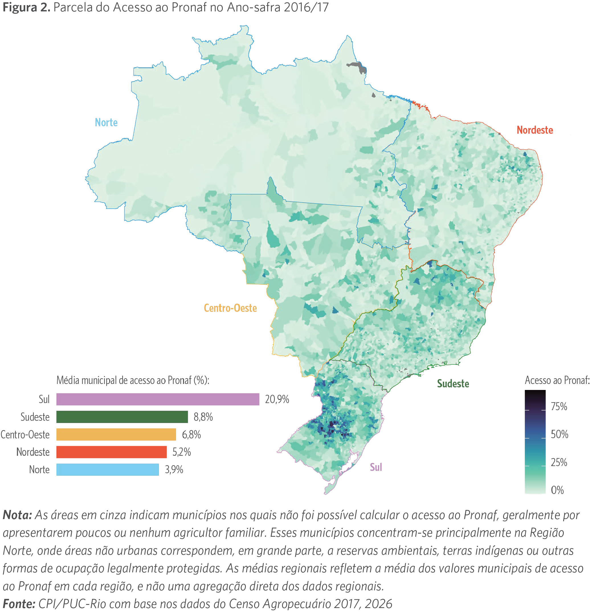 Nota: As áreas em cinza indicam municípios nos quais não foi possível calcular o acesso ao Pronaf, geralmente por apresentarem poucos ou nenhum agricultor familiar. Esses municípios concentram-se principalmente na Região Norte, onde áreas não urbanas correspondem, em grande parte, a reservas ambientais, terras indígenas ou outras formas de ocupação legalmente protegidas. As médias regionais refletem a média dos valores municipais de acesso ao Pronaf em cada região, e não uma agregação direta dos dados regionais.