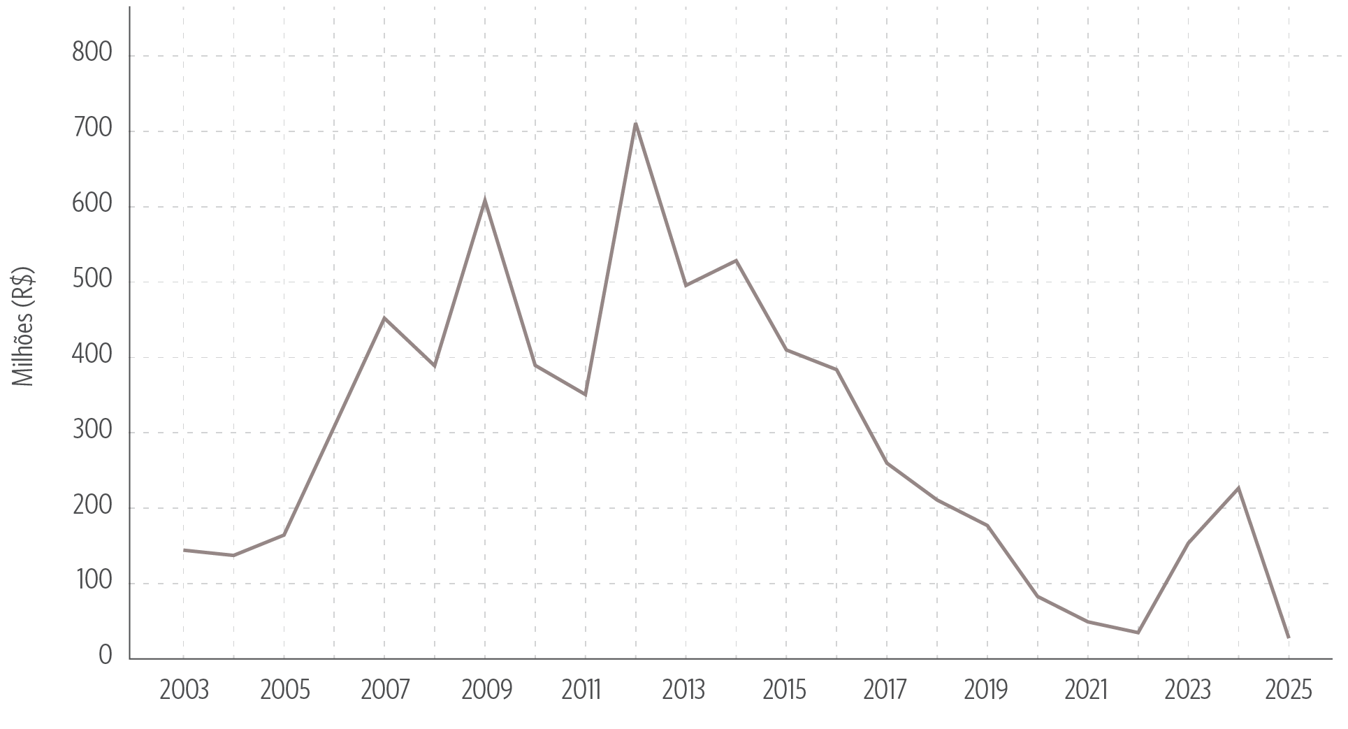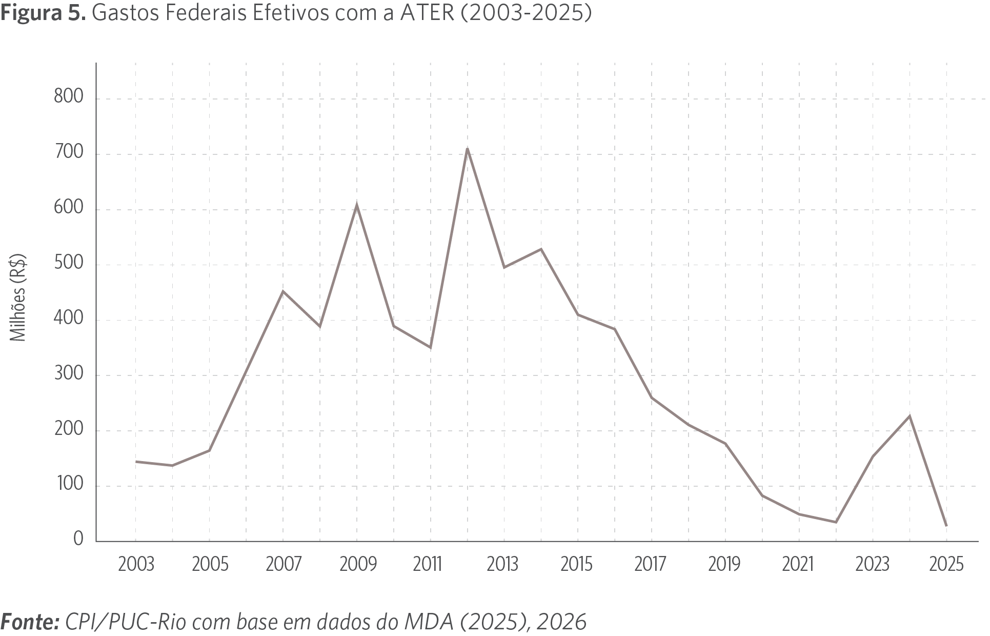 Ainda que a ATER tenha orçamentos de centenas de milhões de reais (R$ 240 milhões previstos para o Plano Safra 2025/2026),[17] é relevante analisar os dispêndios efetivos com essa política pública. Através da Lei de Acesso à Informação (LAI),[18] o CPI/PUC-Rio obteve junto ao MDA os dispêndios efetivos com a ATER de 2003 até outubro de 2025 (último dado disponível). Os valores monetários se encontram todos deflacionados aos preços de junho de 2025, com base no Índice de Preços ao Consumidor Amplo (IPCA) do IBGE, mês e ano no qual houve a divulgação do Plano Safra 2025/2026. Esses valores monetários são exibidos na Figura 5 a seguir.