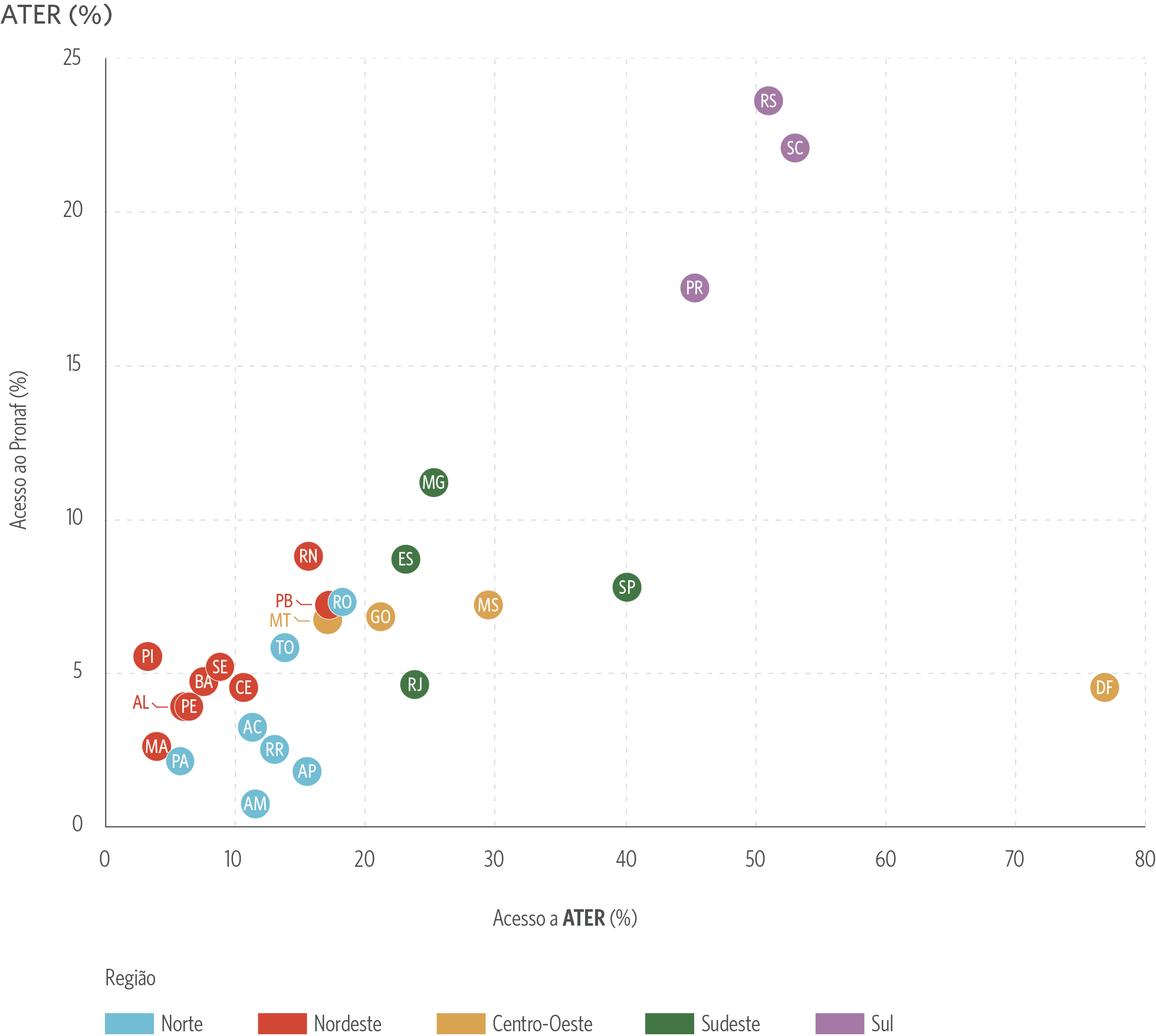 A literatura acadêmica já aponta que agricultores com maior nível de escolaridade, maior faixa etária e residentes na Região Sul tendem a ter maior acesso ao Pronaf.[6],[7] Neste estudo, pesquisadores do CPI/PUC-Rio simularam qual seria o acesso ao crédito caso os estados brasileiros das Regiões Norte, Nordeste, Centro-Oeste e Sudeste tivessem as características dos estados da Região Sul. Os resultados indicam que a assistência técnica e extensão rural (ATER) é o vetor mais relevante para aumentar o acesso ao Pronaf nas Regiões Norte e Nordeste, enquanto a associação a cooperativas é o fator mais relevante para as Regiões Sudeste e Centro-Oeste.