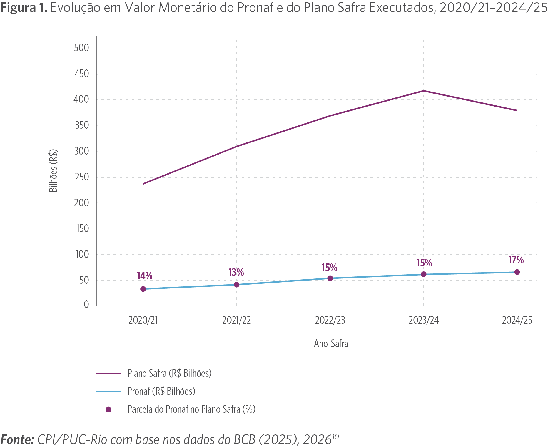 Figura 1. Evolução em Valor Monetário do Pronaf e do Plano Safra Executados, 2020/21–2024/25