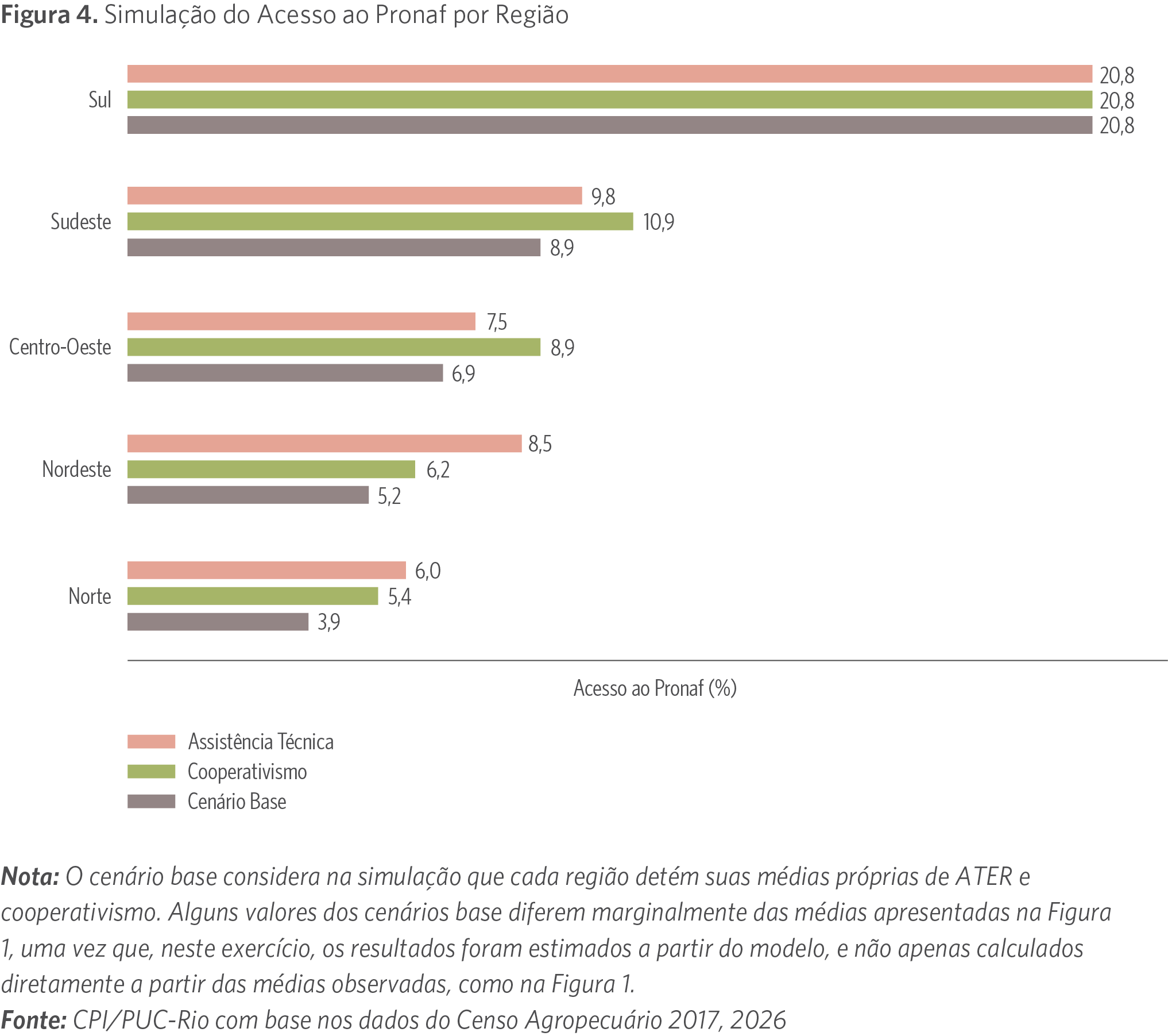 A Figura 4 apresenta os resultados dessas simulações, comparando o acesso ao Pronaf no cenário observado em cada região com cenários em que uma das variáveis estruturais é equiparada ao nível da Região Sul. Para explicitar diferentes dinâmicas, os pesquisadores consideram qual seria o ganho de acesso ao Pronaf caso as outras regiões tivessem o mesmo nível de associação ao cooperativismo e de ATER.