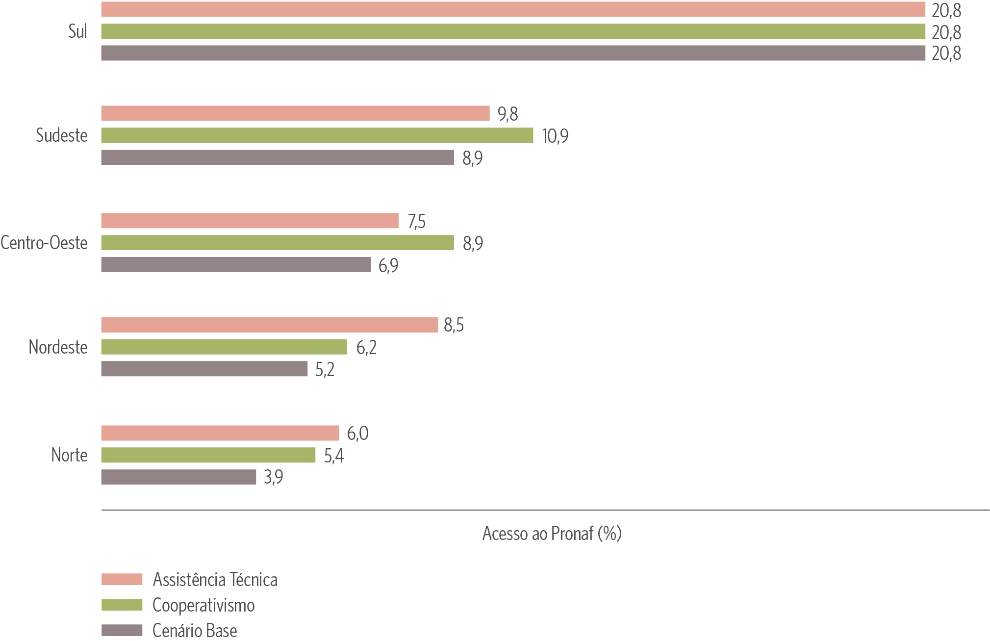 Nota: O cenário base considera na simulação que cada região detém suas médias próprias de ATER e cooperativismo. Alguns valores dos cenários base diferem marginalmente das médias apresentadas na Figura 1, uma vez que, neste exercício, os resultados foram estimados a partir do modelo, e não apenas calculados diretamente a partir das médias observadas, como na Figura 1.