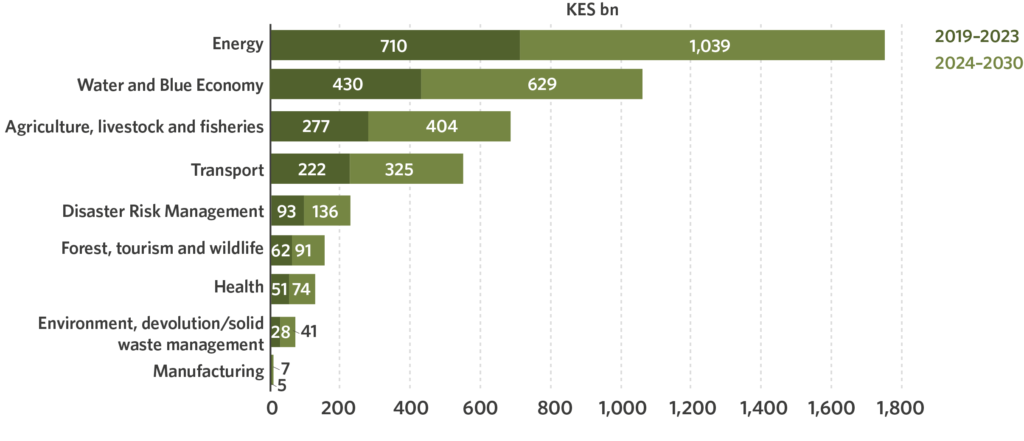 In 2015, the Government of Kenya submitted its nationally determined contribution (NDC) to the Paris Agreement, a landmark agreement to combat climate change. Kenya pledged to reduce its greenhouse gas (GHG) emissions by 30% by 2030 relative to the business-asusual scenario. At the time, the Government of Kenya estimated that KES 4,040 billion (USD 40 billion) would be needed by 2030 to meet its NDC target. In 2018, these numbers were revised upwards in its National Climate Change Action plan (NCCAP) to KES 1,848 billion (USD 18.3 billion) for the 2018-2022 period only, equivalent to nearly KES 465 billion a year (USD 4.6 billion). In December 2020 the Government submitted an updated NDC further increasing the need. The current estimated cost of implementing Kenya’s mitigation and adaptation actions stands at KES 6,775 billion (USD 65 billion) in 2020-2030.