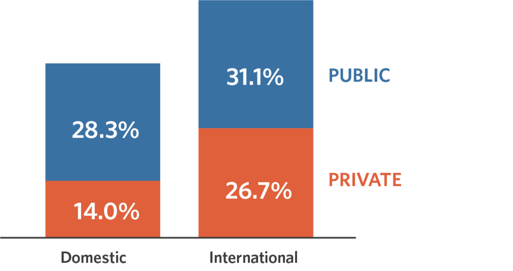In 2018, KES 243.3 billion (USD 2.4 billion) of public and private capital was invested in climate-related activities. This is approximately one third of the financing that Kenya needs annually to meet the targets set in its NDC. Overall, public investment (from domestic and international providers) totaled KES 144.3 billion (59.4%) while investment from the private sector totaled KES 98.9 billion (40.7%). In order to meet the climate ambitions outlined in the NDC, both public and private climate finance needs to be scaled-up significantly by 2030.