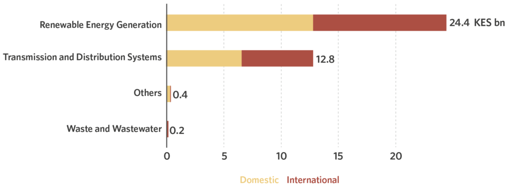 Investment from the private sector totaled KES 98.9 billion (USD 979 million), 34.4% originating domestically from Kenyan companies through their own resources and 65.6% from overseas private companies investing into projects located in the country. Private finance represents almost 41% of total climate finance tracked in Kenya, and most of this was directed to renewable energy generation.