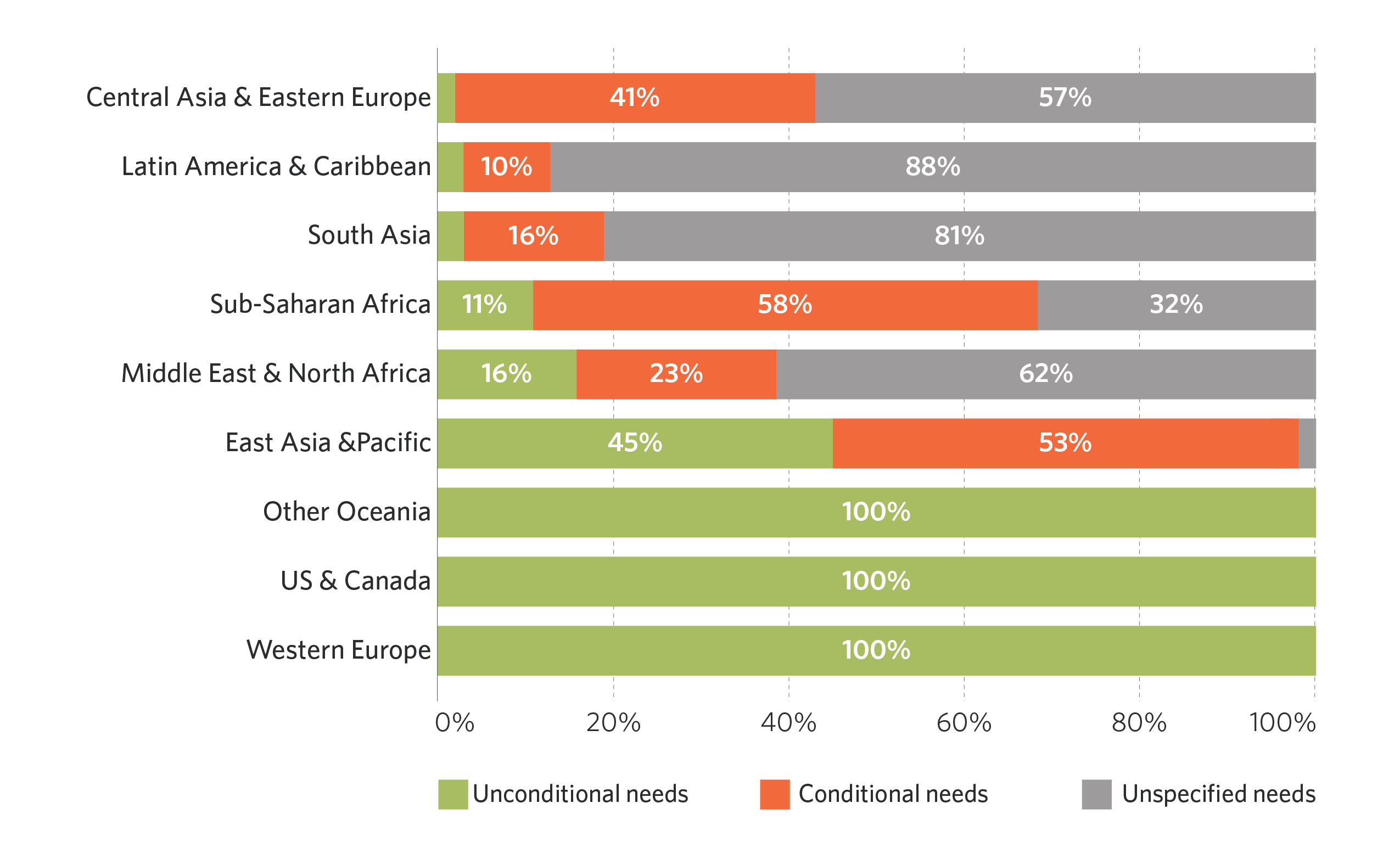 As shown in the figure below, more than half of stated needs are contingent on international support in many regions, including sub-Saharan Africa, the Middle East, and North Africa, East Asia and the Pacific, and Central Asia and Eastern Europe.