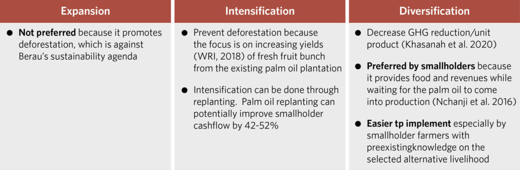 Meanwhile, intensification through replanting requires a high amount of capital and technical knowledge, both of which are currently lacking among independent smallholders. Diversification, which includes planting additional crops that can coexist with palm oil, is therefore the most efficient option, as it does not incur a large amount of capital but promises high returns, and does not require intensive capacity building.