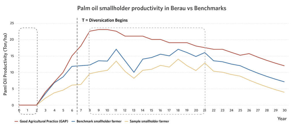 Promoting more diversified plantations can help Berau achieve sustainability while improving economic resiliency. This increases land use effectiveness and reduces smallholders’ sensitivity towards market price volatility, all while providing revenue during the beginning and the end of the palm oil life cycle, or the zero and declining productivity period.
