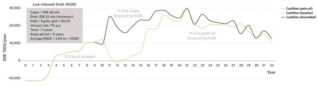 To ensure positive cashflows, diversification is best started during the period where smallholders are generating high cash revenues from their existing palm oil plots, as this is the most bankable period for smallholders to access finance.