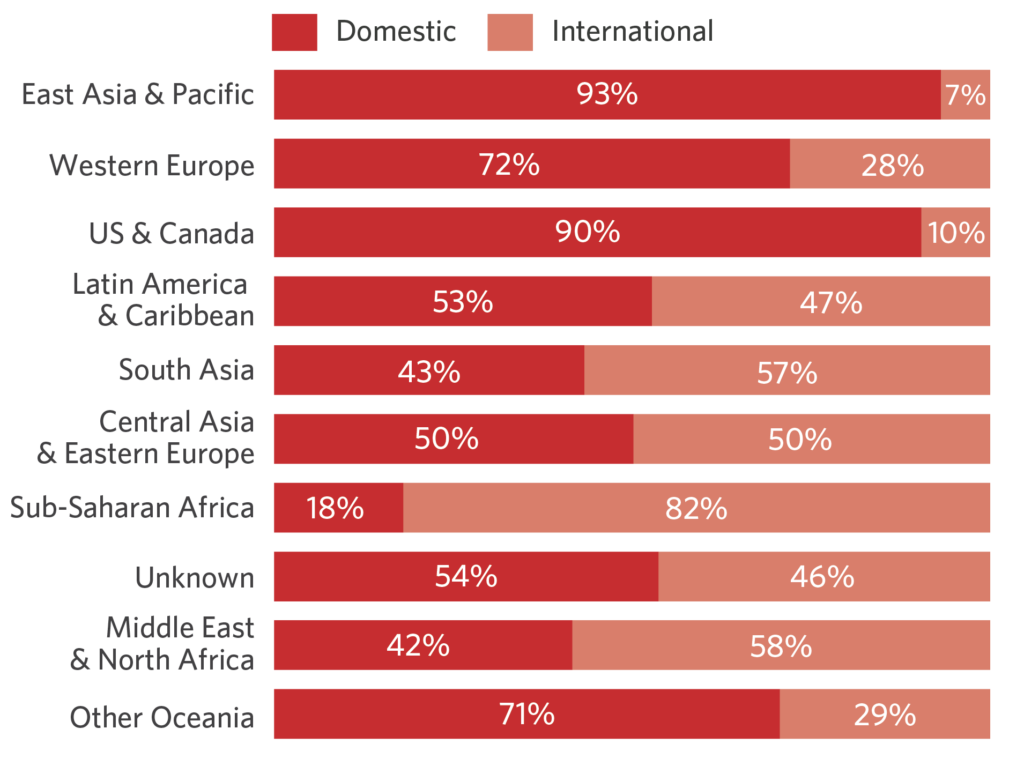 6: 76% of climate finance was raised domestically, primarily concentrated in East Asia & Pacific (dominated by China), North America, and Western Europe, confirming the importance of national regulations and enabling environments. While Central Asia and Eastern Europe attracted both domestic and international climate finance. Across all regions, there is a lack of consistently reported data on domestic public climate finance.