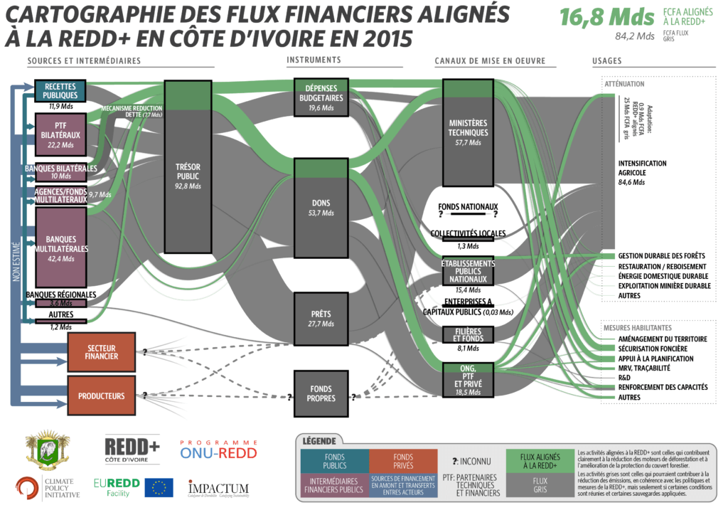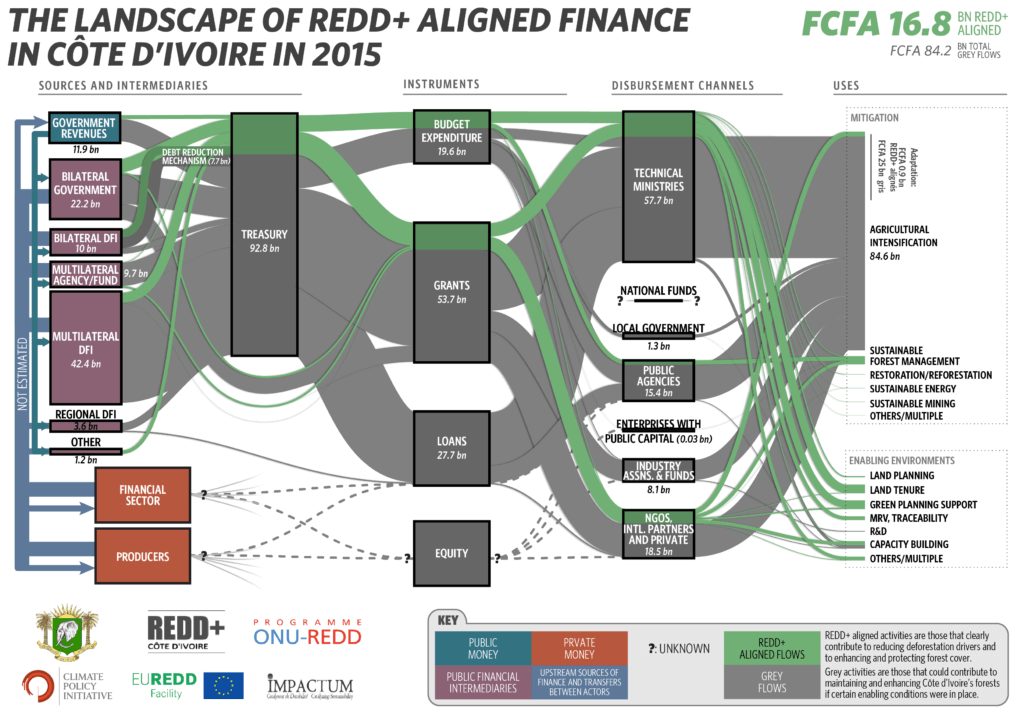 The Landscape of REDD+ Aligned Finance in Côte d’Ivoire shows public finance that went to activities that impact on land use in 2015 and that are therefore considered “relevant” in the context of Côte d’Ivoire’s National REDD+ Strategy. These sectors include agriculture, forestry, domestic energy, environment, mining, and planning policy.