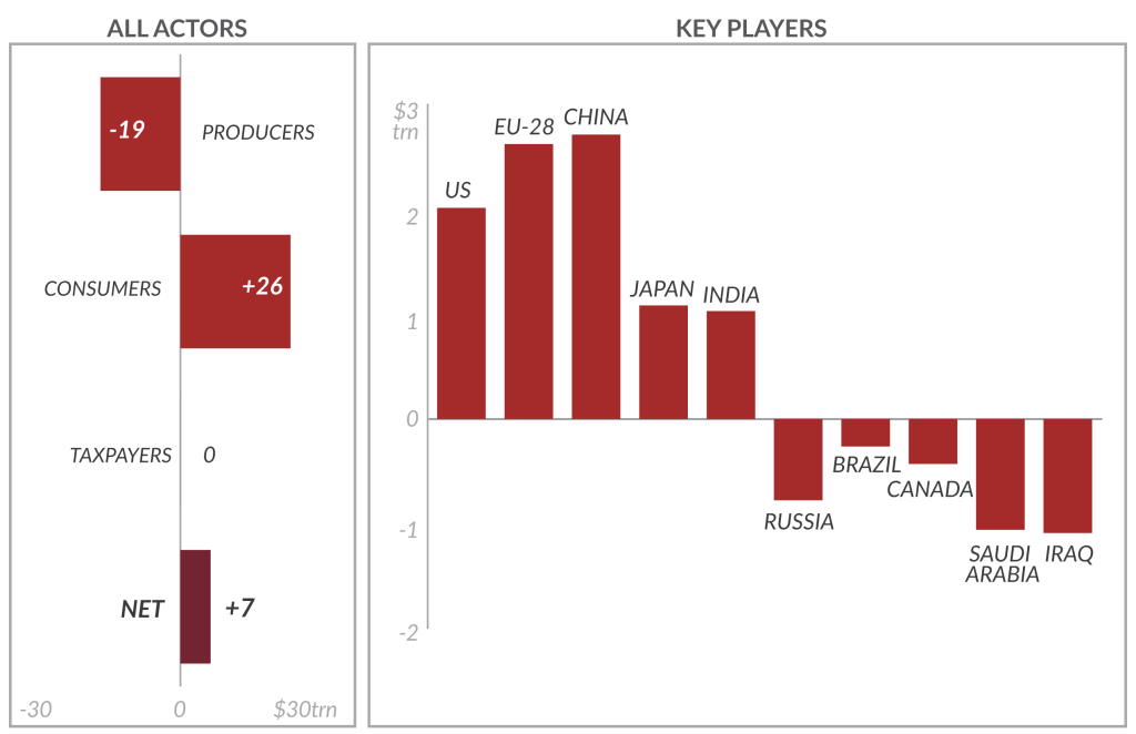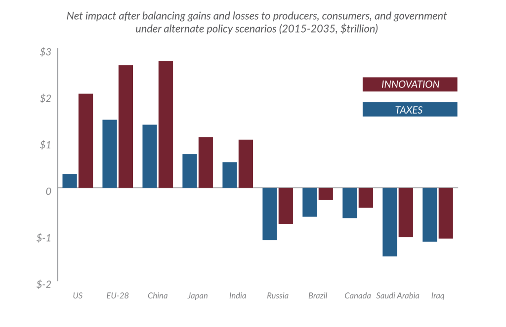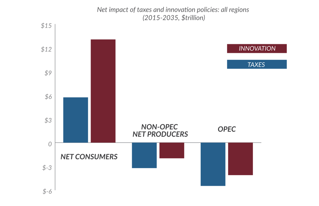 - Transitioning from oil to low-carbon transport could increase global investment capacity by trillions or result in net costs, depending on policy choices. Regions that import more oil than they produce — including the United States, Europe, China, and India — stand to benefit most from together reducing their oil consumption in favor of low-carbon alternatives regardless of whether oil-producing countries choose to act. However, if oil-importing countries act then oil producers can significantly reduce the impact on their economies by shifting to low-carbon alternatives.
