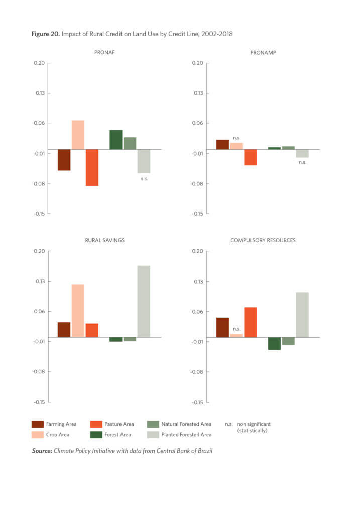 Recent research finds that Brazil can increase crop production by 79-105% and beef production by 27% without deforestation (Assunção and Bragança, 2019). However, to achieve significant gains in agricultural productivity, farmers will need to invest considerable resources to modernize their operations by purchasing farm equipment and spending more in fertilizer. Another recent study finds that rural credit alleviates producers’ constraints, increasing both labor and land productivity and leading to intensified production and reduced pressures on deforestation (Assunção, Fernandes, Mikio and Souza, 2020). The productivity gains and the improvements in land use are found to be especially pronounced for credit directed to small farmers.