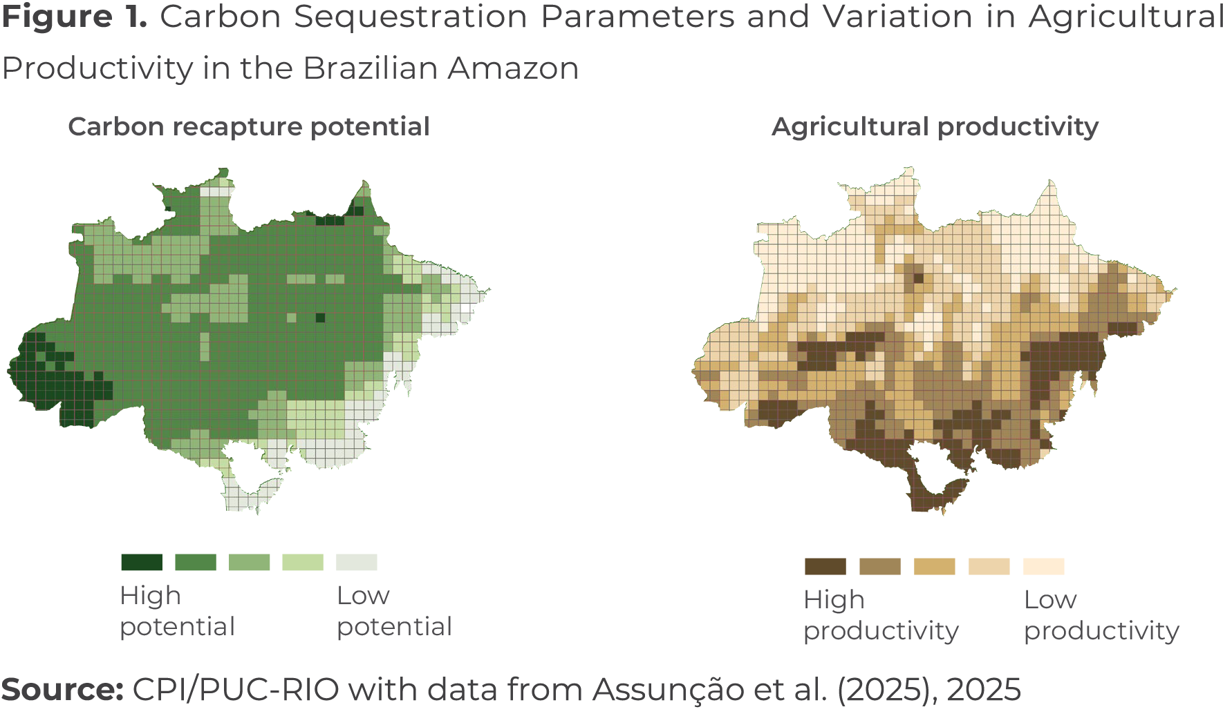 The Amazon is far from homogeneous: the biome encompasses both ecological and productive diversity that differ in their capacity for carbon capture potential and agricultural suitability. Certain areas, due to their biological and soil characteristics, have a high capacity to store carbon, acting as major carbon sinks. Other areas are better suited for agricultural production, especially cattle ranching, which has historically been the main driver of deforestation.