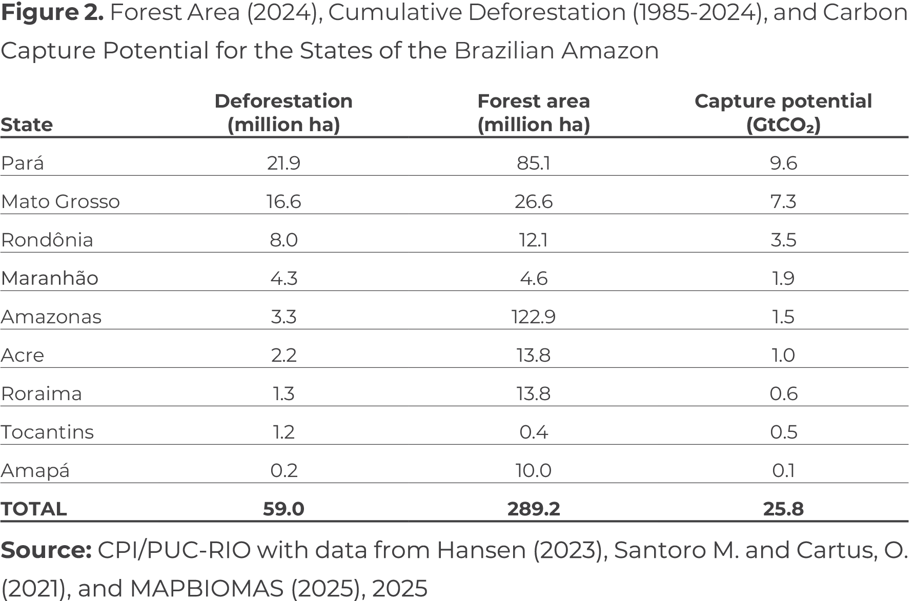 Figure 2. Forest Area (2024), Cumulative Deforestation (1985-2024), and Carbon Capture Potential for the States of the Brazilian Amazon