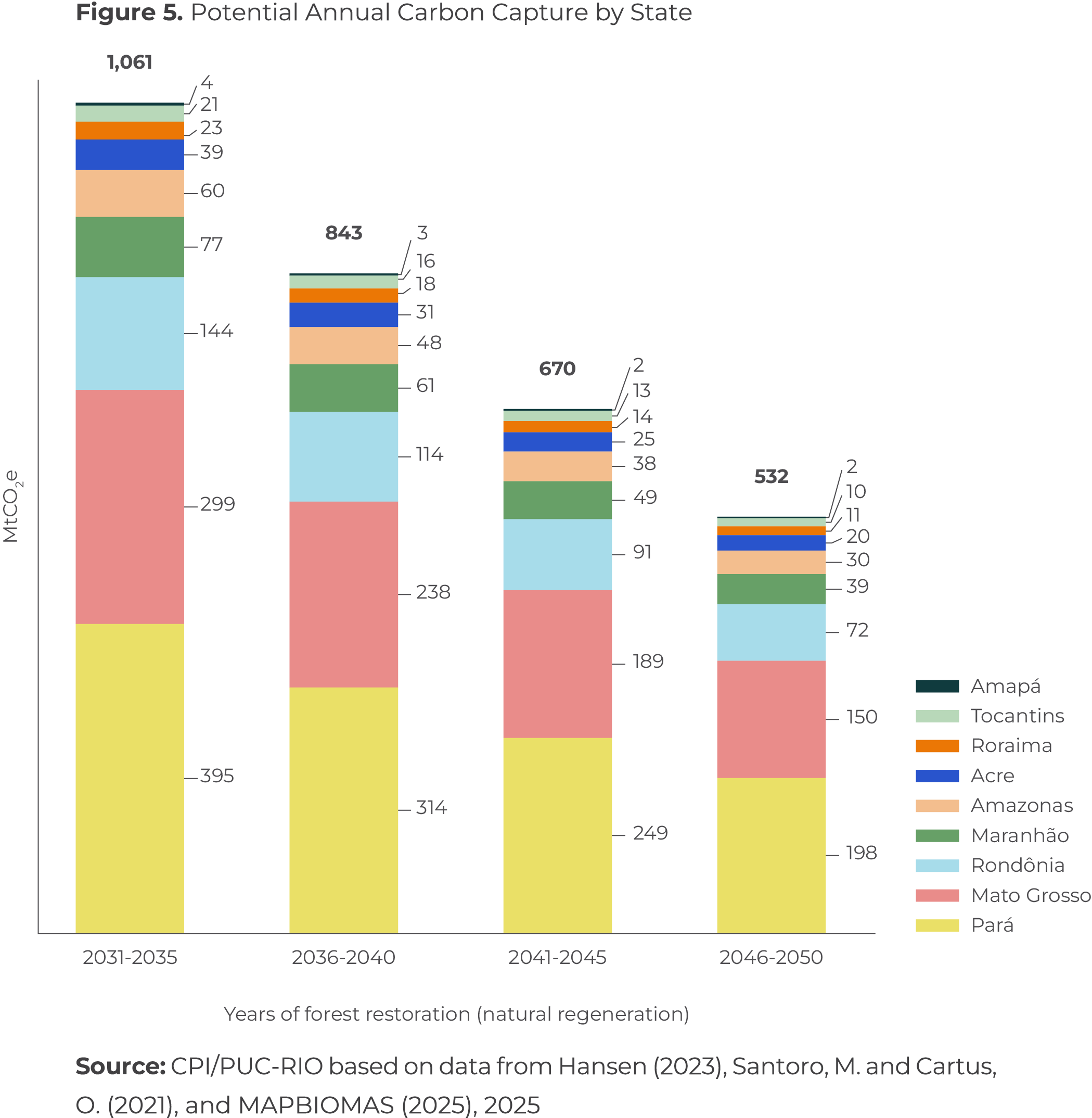 This report indicates that natural regeneration in already deforested areas could capture up to 26 GtCO2 across the Amazon region. Figure 5 breaks down this potential by state, showing how restoration opportunities are distributed over time and space. This breakdown makes it possible to assess both the timing and the climate relevance of these captures, which tend to decline over the years as forest growth stabilizes and carbon absorption decreases with ecosystem maturation. The projection assumes restoration efforts will begin in 2031, in line with the commitments made in the COP28 Global Stocktake, and presents the results in five-year intervals, aligned with the Paris Agreement’s review cycles and increased climate ambition goals.