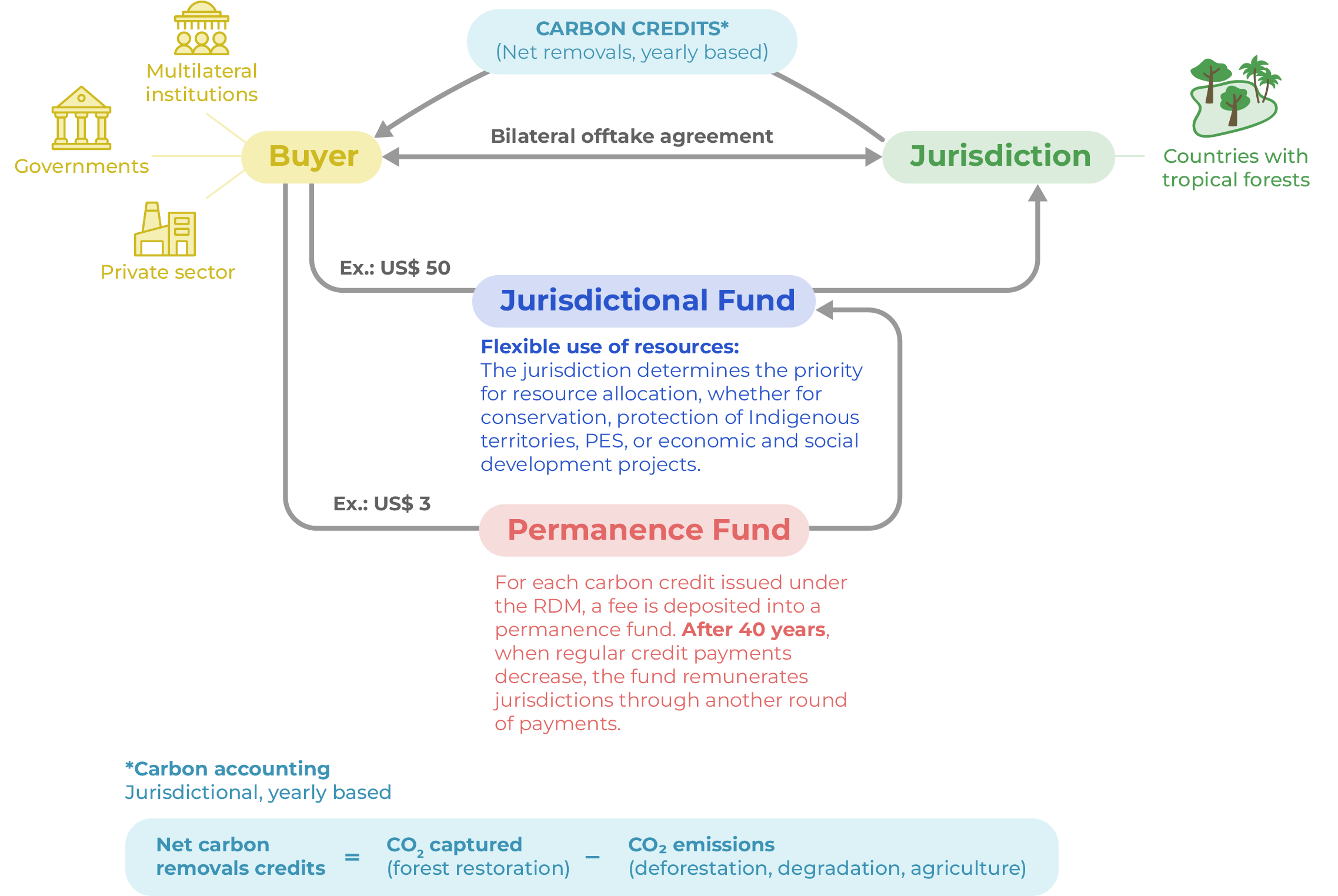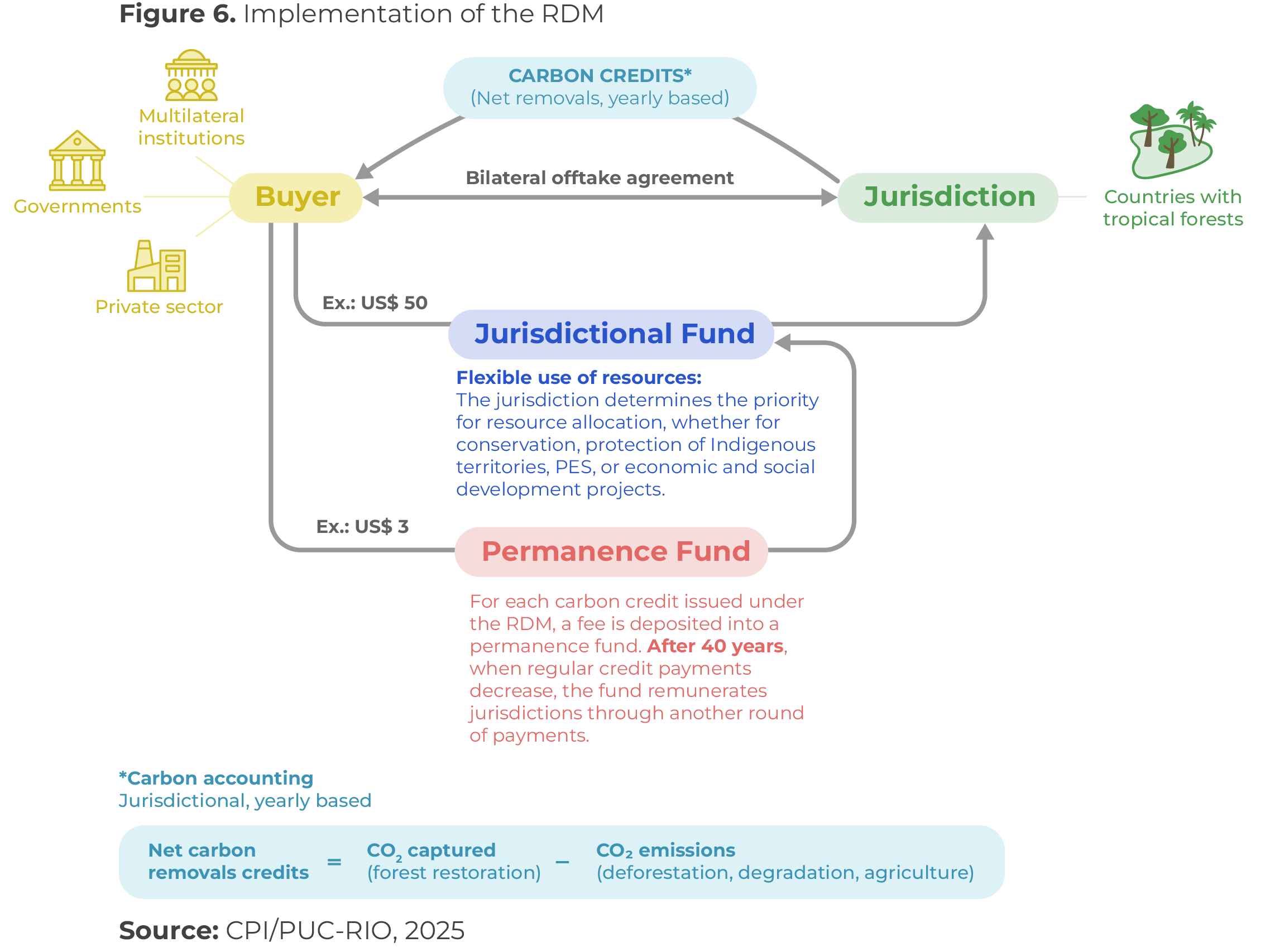 The Reversing Deforestation Mechanism (RDM), developed by CPI/PUC-RIO, is a jurisdictional, results-based payment mechanism that remunerates net carbon removals achieved through forest restoration.[6] It operates through carbon credit purchase agreements between a buyer and a jurisdiction at a pre-agreed price. The effective implementation of the RDM requires clear measurement systems, governance, and finance to ensure that carbon credits reflect net carbon capture and that the resources generated promote forest conservation and sustainable development.