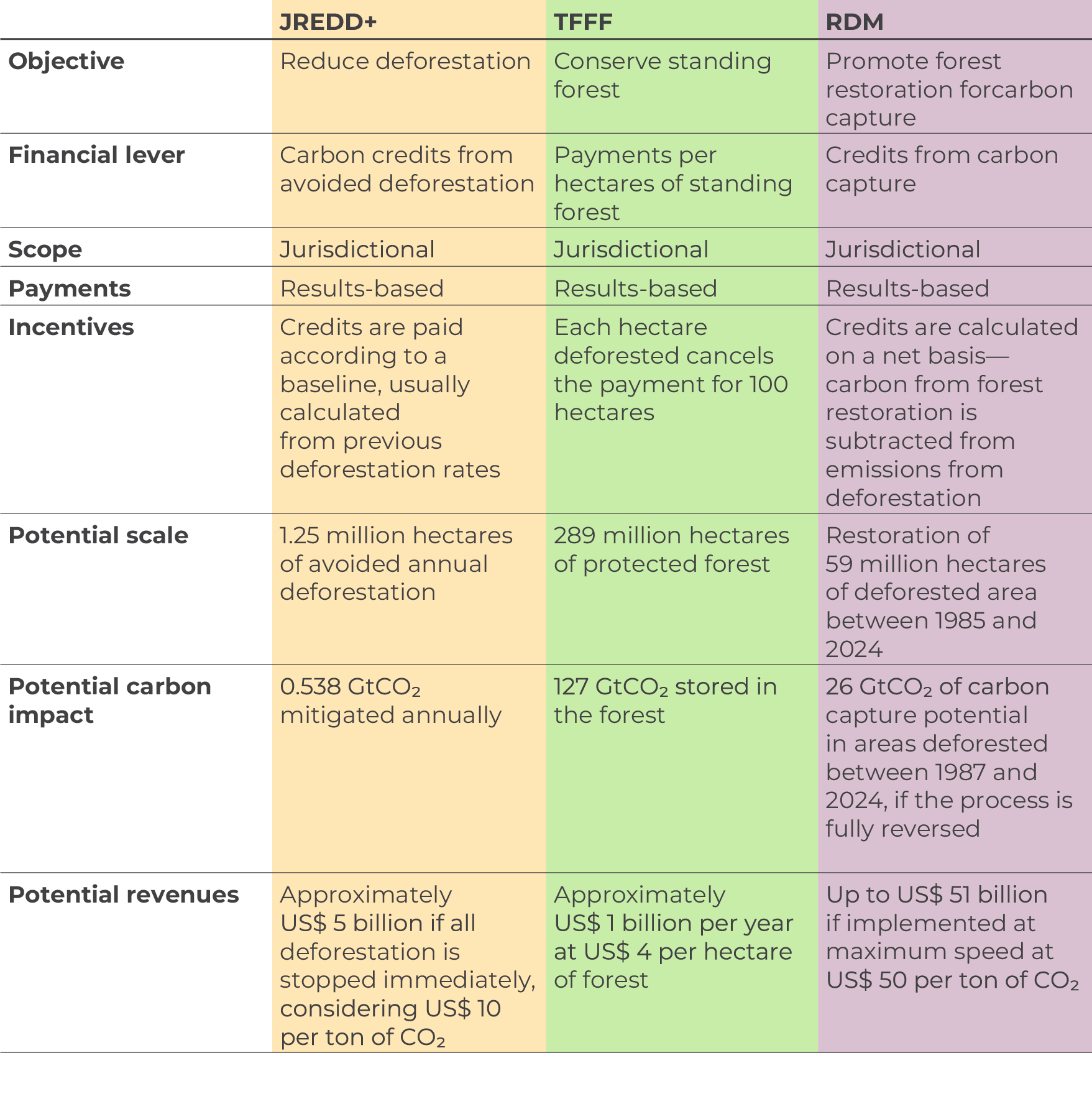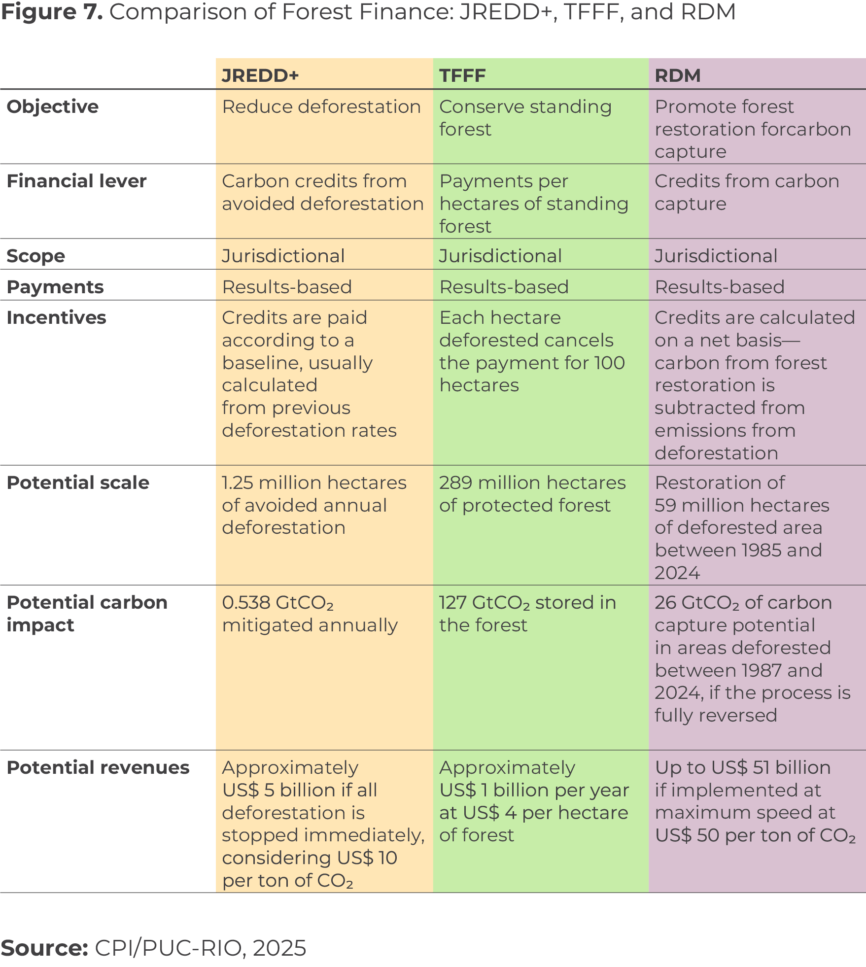 These three mechanisms play complementary roles in advancing forest and climate goals. JREDD+ provides incentives for reducing deforestation, the TFFF offers compensation for maintaining standing forest, and the RDM remunerates large-scale carbon capture through restoration. Together, they form a financial architecture capable of addressing the multiple dimensions of the Amazon’s transition to a low-carbon economy. Figure 7 compares the potential and performance of these three mechanisms.
