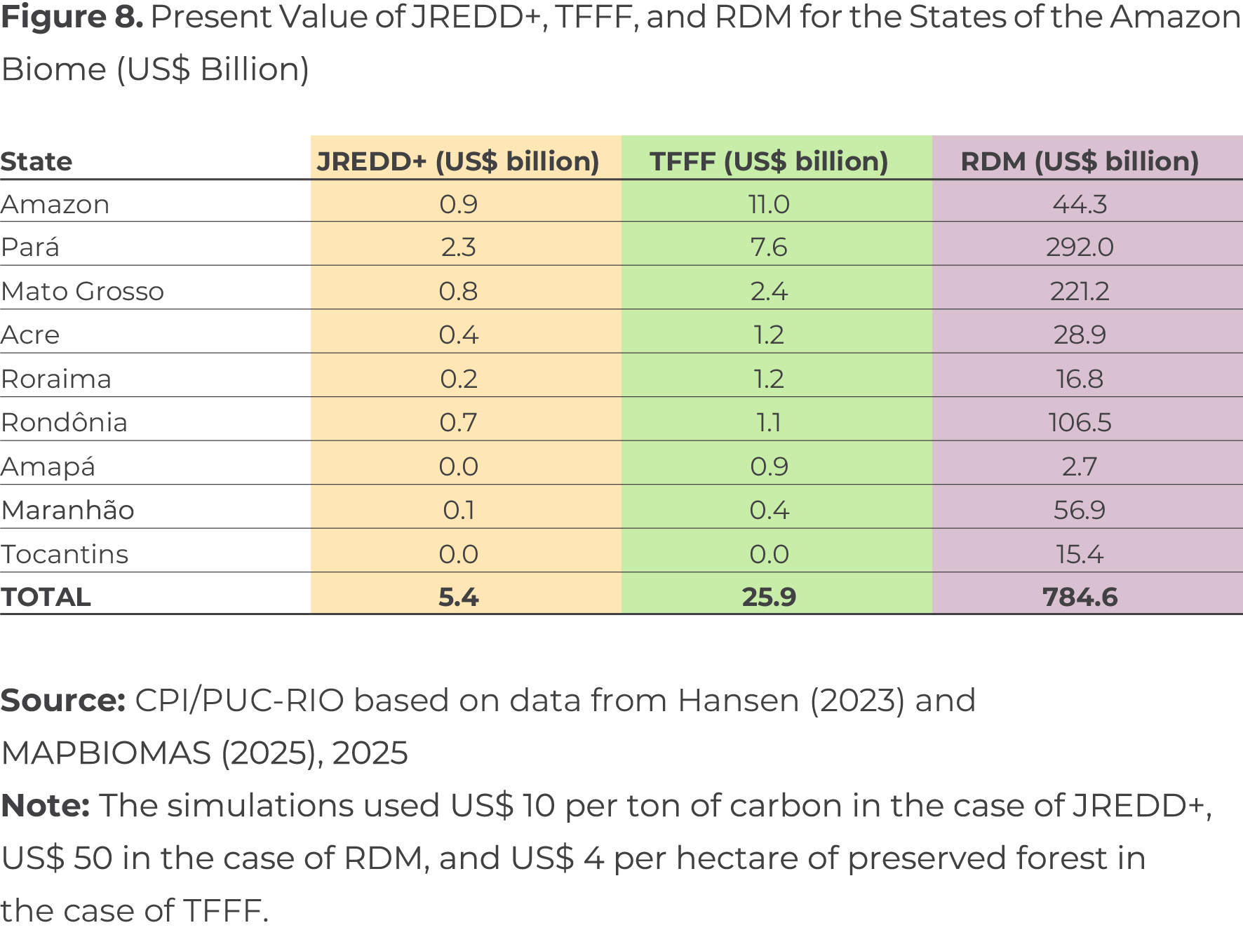 These mechanisms offer significant economic potential. In the Amazon, the TFFF could generate approximately US$ 26 billion in revenue, while the RDM could reach approximately US$ 784 billion over the next 30 years, with carbon priced at US$ 50 per ton. According to Assunção, Hansen, Munson, and Scheinkman (2025), this amount would already be sufficient to achieve a land-use reallocation consistent with Brazil’s NDC. Within its first five years, the RDM alone could capture 5.3 GtCO2. In contrast, JREDD+, if operated independently, could generate just over US$ 5 billion for the Amazon through avoided deforestation.