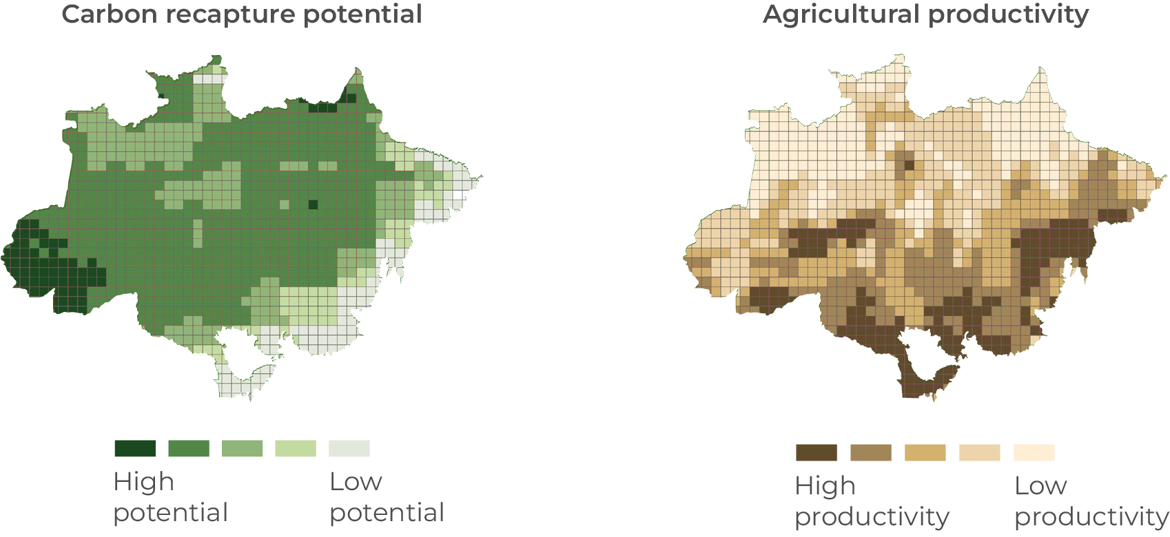 As shown in Figure 1, these two functions rarely overlap. Areas with high carbon capture potential tend to have lower agricultural productivity, while those most suitable for agriculture and livestock tend to have lower carbon sequestration capacity. This spatial heterogeneity presents a strategic opportunity: by optimizing land use in the Amazon, it is possible to increase agricultural production in cleared areas while conserving and restoring forests in others—maximizing both economic returns and climate benefits.