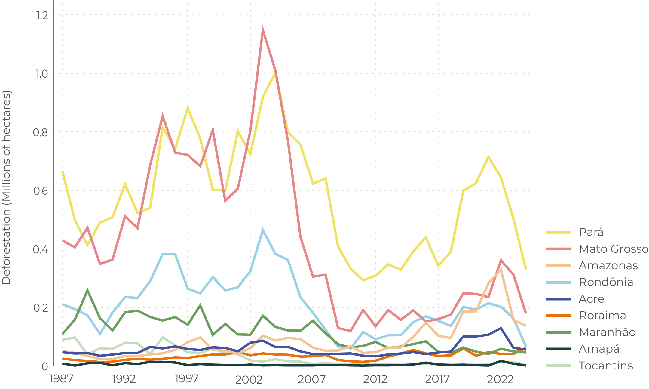 Figure 3. Deforestation Trajectory (1985-2024) by Brazilian State in the Amazon Biome