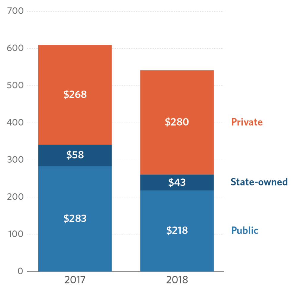 Based on our updated analysis and estimation following newly available information, climate finance flows reached USD 574 billion per year on average in 2017/18. This results in total climate finance flows of USD 608 billion in 2017 and USD 540 billion in 2018 (as compared to USD 611 and USD 546 billion reported, respectively, in 2019’s Landscape). The slight decline is the result of adjustments to numbers issued by our data providers after the publication of the 2019 Landscape.
