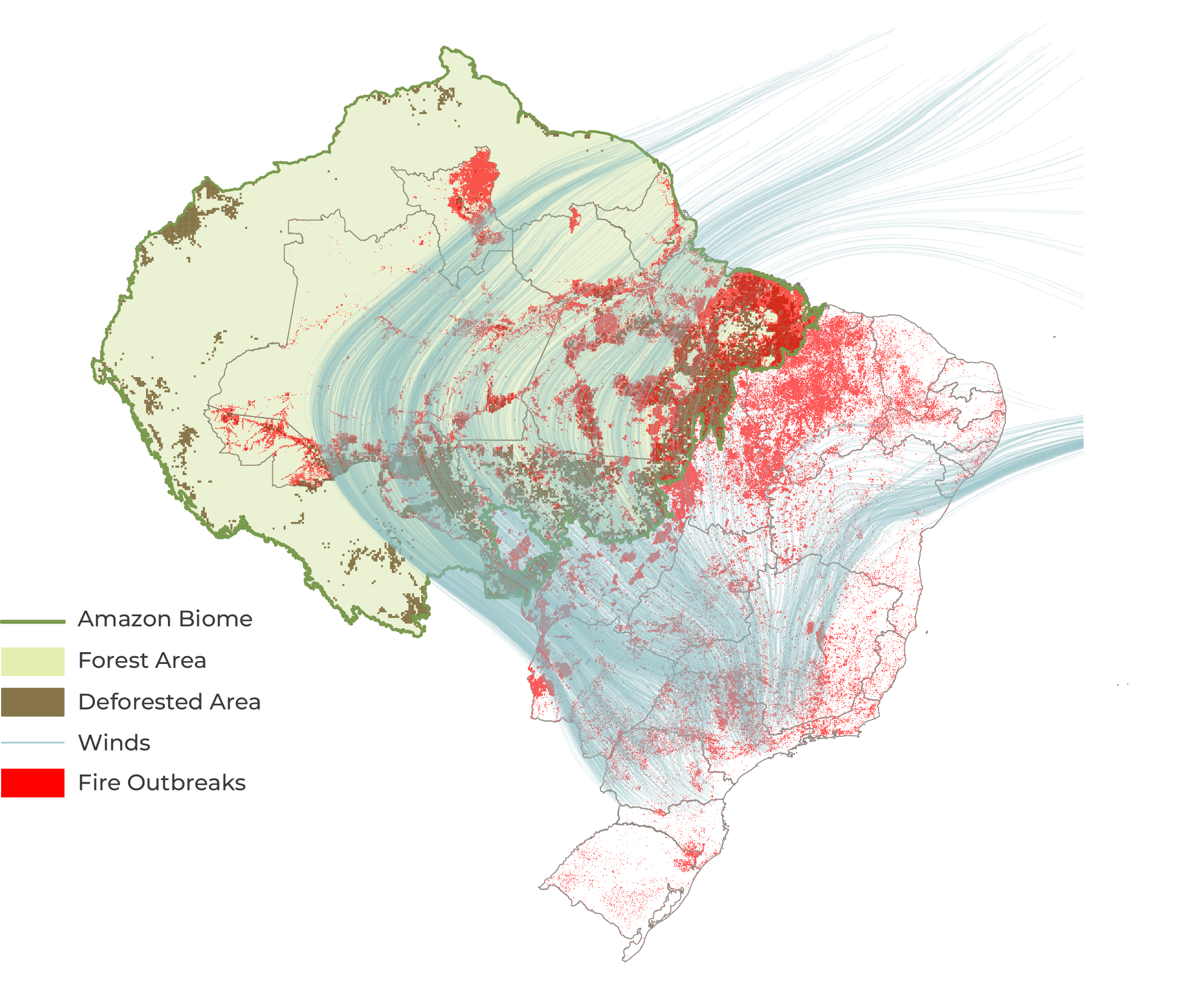 Research shows that water availability is a key factor in vegetation’s resilience to wildfires, while drought conditions significantly heighten fire risk.[36],[37] Reduced rainfall associated with deforestation can therefore compromise ecosystems’ natural ability to resist fire. As illustrated in Figure 7, the flying rivers pass near the wildfire outbreak zones, suggesting that changes in this mechanism may already be influencing wildfire patterns across several regions of the country.