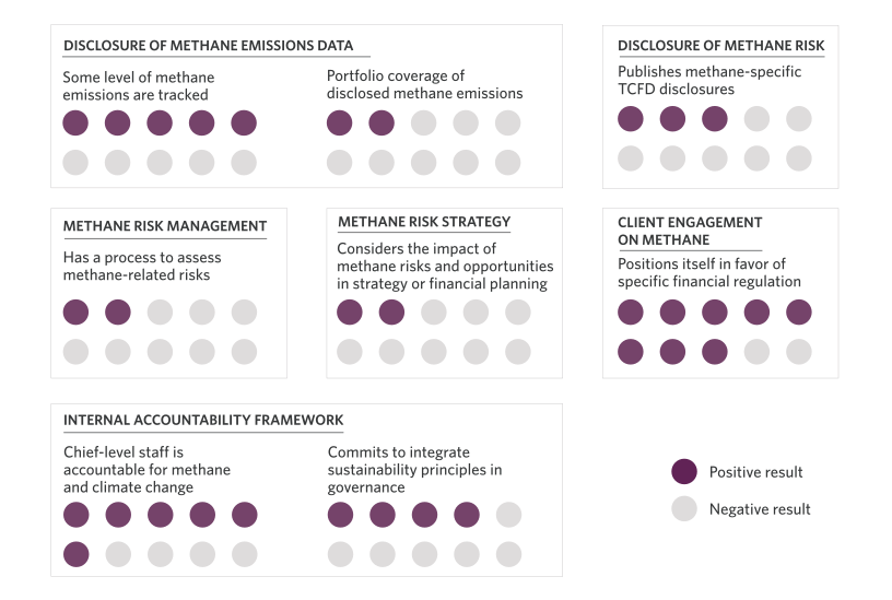 To credibly align with net-zero pathways, FIs must not only make high-level commitments, but also set quantifiable, time-bound sector-specific methane targets linked to their financed emissions. Methane considerations should also be embedded into risk management and client engagement processes. With few current leaders, FIs that disclose greater action on methane through their transition plans can demonstrate accountability and reduce their transition risks associated with financing these emissions.
